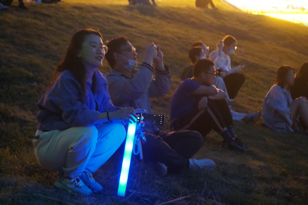 傍晚6点的天工湖畔,春风习习,绿草茵茵,全体参演者提前到达演出现场,讨论曲目安排进行表演彩排,调试录像设备为未能到场的同学提供线上直播。落日西沉,晚星渐明,精心布置的现场灯光闪烁,观众们按照防疫要求佩戴好口罩,在轻快温馨的氛围中有序入场,于枫树林旁的草坡上间隔落坐,面朝天工湖的依依垂柳,头顶兴隆山的清澈夜空。随着夜幕降临,草地音乐节在主持人激动人心的开场中正式拉开序幕。音乐节共分为“歌曲表演”、“你点我唱”和“自由K歌”三个环节,用表演和互动为观众们带来一场听觉盛宴。