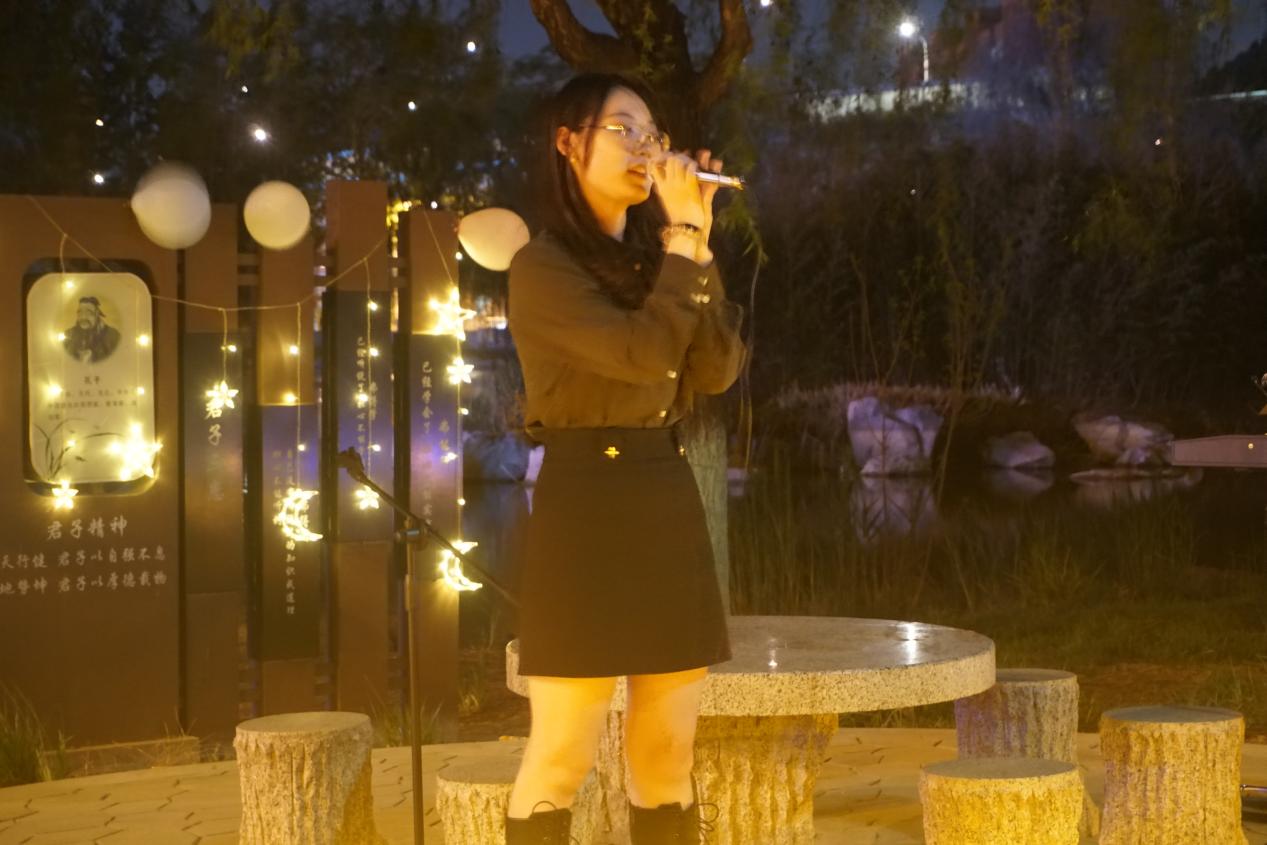一首《起风了》作为表演环节的压轴曲目,以清新怀旧的曲调引发观众强烈共鸣,场下的荧光棒与闪光灯随着歌曲节奏在夜色中起舞,观众与演唱者热情洋溢的齐声合唱将音乐节一步步推向高潮。随后开始了观众们期待已久的“你点我唱”环节。观众们通过线上扫码踊跃报出自己想听的歌曲,吉他弹唱、器乐演奏、乐队合奏、无伴奏清唱,文化艺术团的成员们以灵活多变的演唱形式满足同学们的点歌需求。活动现场,明月与晚星相伴,歌声与情感齐飞,曲目终了,表演者向全场观众送上点歌者的寄语和祝福,博得了热情的欢呼与掌声。