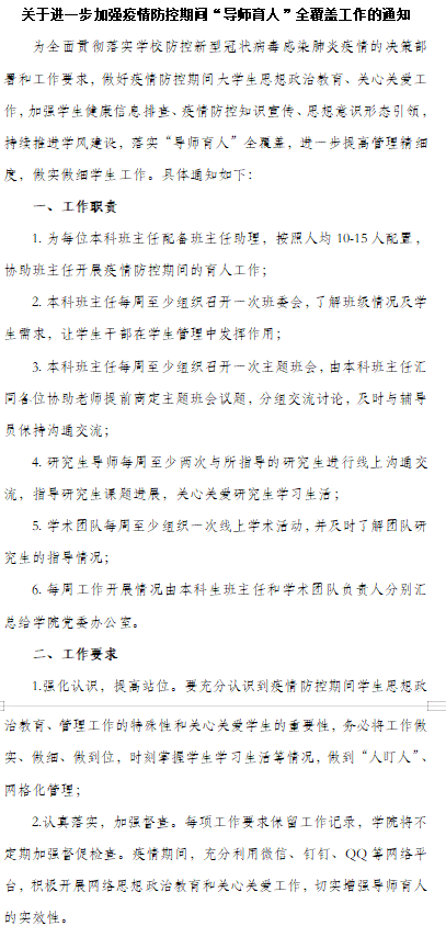 导师覆盖,全面强化思想建设。学院积极开展疫情防控期间大学生思想政治教育、关心关爱工作,加强学生健康信息排查、疫情防控知识宣传、思想意识形态引领,持续推进学风建设,进一步提高管理精细度,做实做细学生工作。学院第一时间发布《关于进一步加强疫情防控期间“导师育人”全覆盖工作的通知》,落实“导师育人”全覆盖,按照人均10-15人标准配置班主任助理,协助班主任开展疫情防控期间的育人工作,本科班主任每周至少组织召开一次班委会、一次主题班会,将工作做实、做细、做到位,时刻掌握学生学习生活等情况,重点关注关心心理困难、经济困难和学业困难学生,做到“人盯人”、网格化管理服务。学院为5位本科生发放疫情期间专项临时困难补助。研究生导师每周两次与所指导的研究生进行线上沟通交流,每周组织一次线上学术活动,指导研究生课题进展,关心关爱研究生学习生活,切实增强导师育人的实效性。