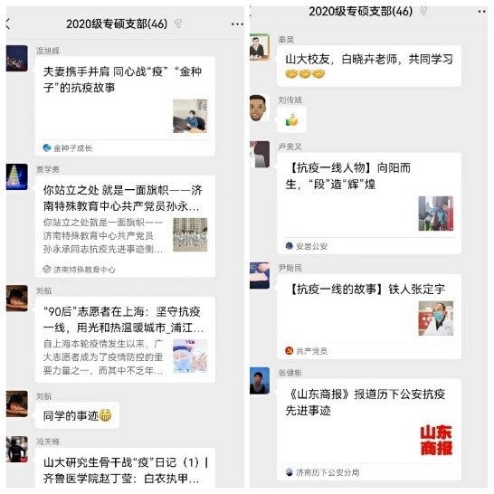 4月24日,2020级专硕支部开展了“学习党史,共战疫情”线上党史学习教育,将观影和分享交流进行了有机结合。活动中,支部成员分享了李雪梅夫妇、杨晓丽夫妇的抗疫事迹并进行了热烈讨论,共同观看了山东省立医院临床医学检验部副主任、中共党员白晓卉同志的纪录片,学习医护人员敬佑生命、救死扶伤、甘于奉献、大爱无疆崇高精神。支部同志也在微信群中积极转发抗疫先进事迹,将在党史学习中的心得感悟,努力将中国精神转化为青春行动,勇做弘扬和践行中国精神的青年先锋。本次活动大大加强了同学们的学习积极性,激励同学们将在党史中汲取的精神内化于心,外化于行,以饱满热情投入祖国的建设。
