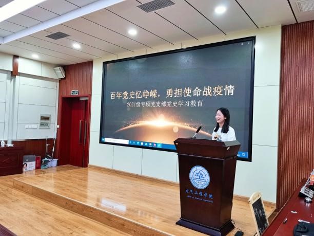 4月22日,2021级专硕党支部在电力楼四楼报告厅举行了“百年党史忆峥嵘,勇担使命战疫情”主题党日学习。主题学习以视频资料与主题演讲相结合的方式开展,主讲同学带领支部成员体会了革命先辈的崇高理想与伟大精神,同时结合我院的专业特色,一同分享了“国网山东电力检修公司带电作业班的副班长——王进”的优秀事迹。该主题党日活动将党史学习与时代楷模先进事迹相融合,汲取其中的精神,在支部内营造了青年大学生学党史、知党情、感党恩、跟党走的良好氛围。
