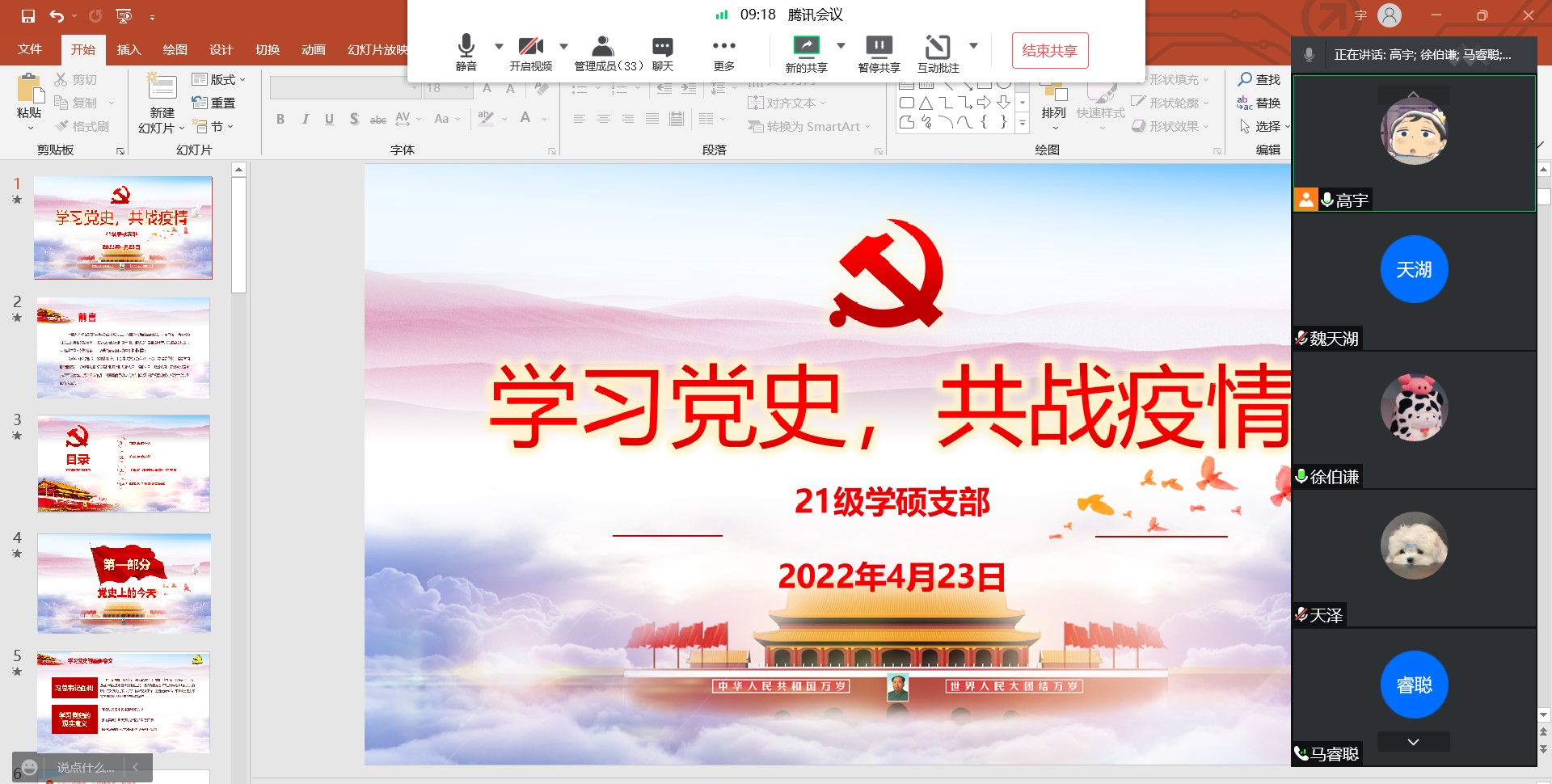 在活动中,支部成员们从1945年4月23日党的第七次全国代表大会的开幕开始,学习了在战乱动荡年代的中国青年的担当与作为。然后,以新时代我们面临的疫情大考为切入点,向支部的各位同志传递济南疫情信息,强调疫情形势的严峻性。之后,结合最近发布的《新时代中国青年》白皮书,支部成员们分享体会与感悟,传达国家对新时代的青年的希望与要求,表达作为新时代青年的我们的新担当与新作为。最后,同志们重温《山东大学全体党员倡议书》,勉励大家一起成为科学的防护者、抗疫的表率者、师生的服务者、环境的营造者。
