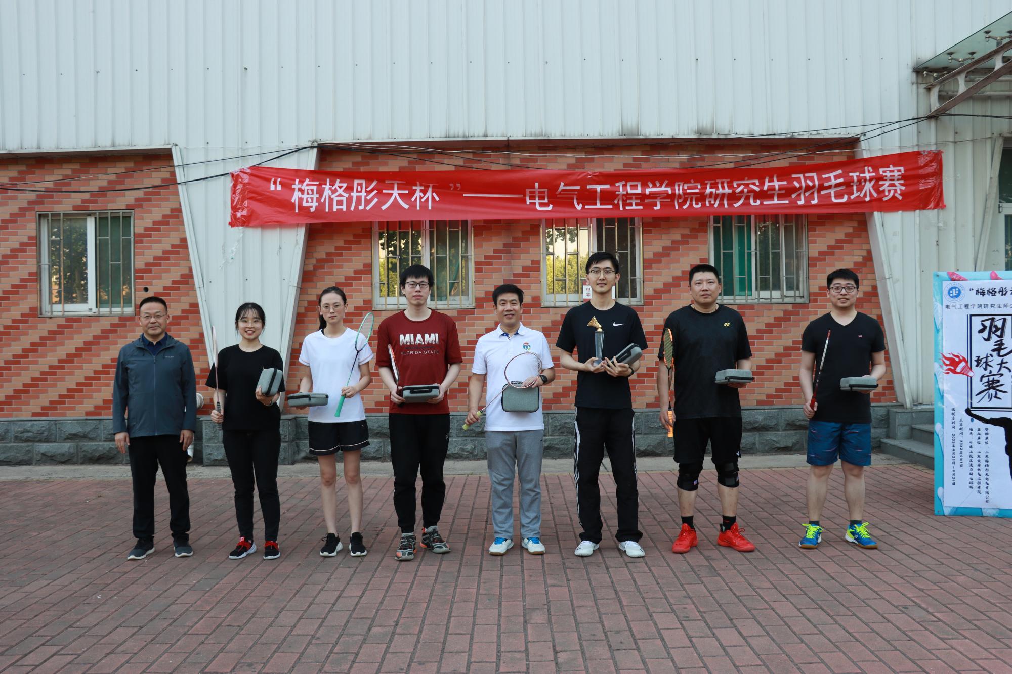 比赛结束后,学院党委副书记宋思利主持颁奖仪式并致辞,庆祝本次活动的圆满成功,向参赛队伍、赞助商伙伴——山东梅格彤天电气有限责任公司和赛事主办人员表示感谢,并鼓励同学们继续团结向上,努力拼搏。随后学院党委书记殷录民与院长丁磊为获奖队伍颁发奖杯和奖品,并合影留念。至此,本次研究生羽毛球比赛圆满结束。