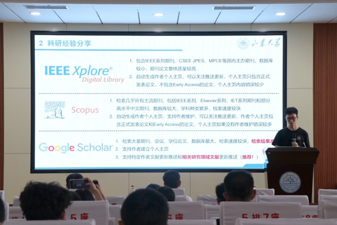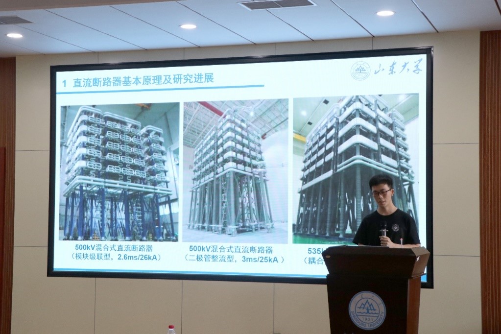 张烁首先作了题为“直流断路器基本原理及研究进展”的报告。在目前的电力行业发展形势下,多端柔性直流输电技术在实现大规模可再生能源集中并网方面有着突出优势,该输电技术对直流线路故障处理提出了更大的挑战,张烁针对这一研究课题,深入浅出地介绍了直流断路器的基本原理和研究进展。随后,张烁与在场同学分享了自己的科研经验和感悟,就文献数据库、文献管理工具和文献阅读等进行了详尽地讲解,激励更多电气学子勇攀知识高峰,满满的干货分享也赢得了在场同学的阵阵掌声。
