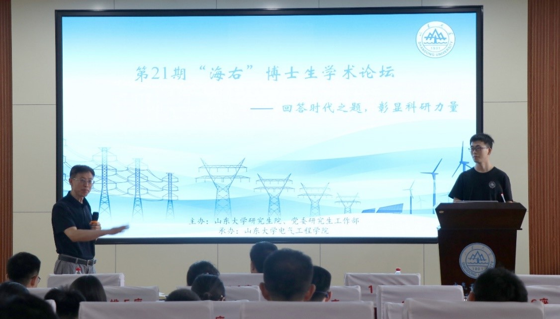 2022年6月15日下午2点30分,由山东大学研究生院、党委研究生工作部主办,yl23411永利集团官网登录承办的第21期(总784期)“海右”博士生学术论坛在千佛山校区电力楼报告厅如期举办,此次论坛邀请2022届博士毕业生张烁作为主讲嘉宾,学院党委副书记宋思利、继电保护研究所所长邹贵彬教授作为点评嘉宾出席了本次论坛。