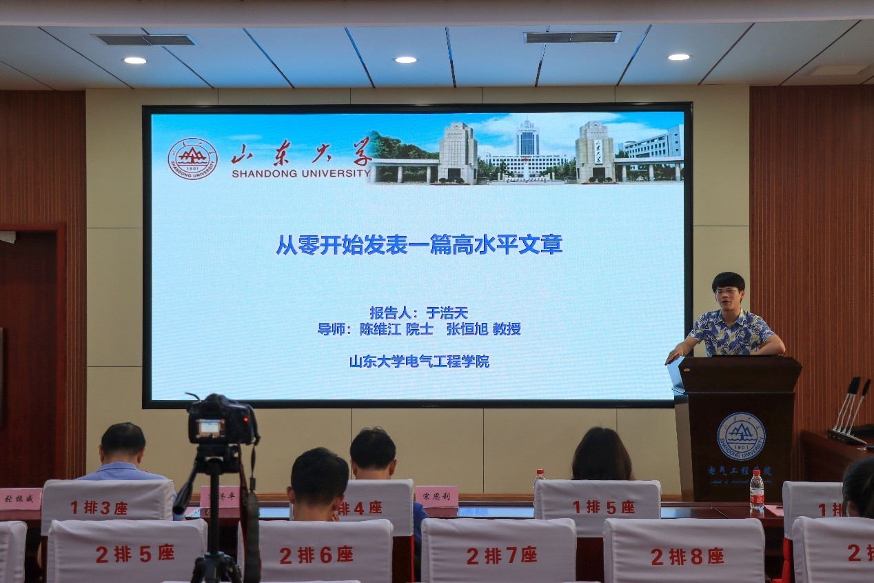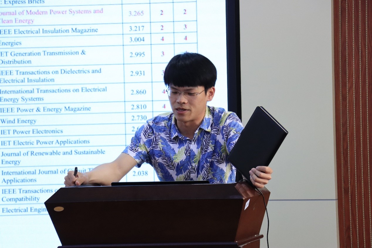 接着,智能电网柔性技术与装备团队2022届毕业生于浩天就“科研方向探索与英文论文阅读与撰写”为主题向大家分享了自己的科研心得,讲述如何“从零开始发表一篇高水平文章”。他首先向大家介绍了什么是高水平期刊,之后从确定研究方向和论文写作流程两个方面给大家介绍了相关知识,确定研究方向包括如何完成一步步选择、如何选择待阅文献以及如何阅读英文文献等,论文写作流程包括找idea、搭建文章框架、完成文章初稿、反复修改以及投稿,于浩天用他严密的逻辑与直接的语言,以自己的投稿实录为例为大家讲解了一篇高水平文章从无到有的生产过程,他告诉大家,好文章是改出来的,发表高水平文章意味着打持久战,这让在场同学受益匪浅。