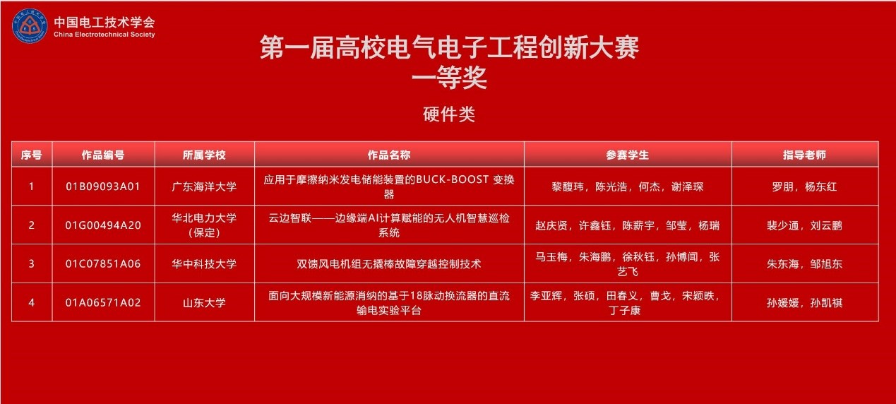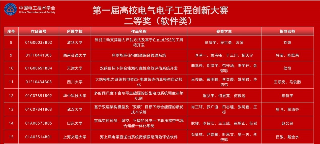 9月15日至17日,由中国电工技术学会主办、教育部高等学校电气类专业教学指导委员会指导的“第一届高校电气电子工程创新大赛”决赛在北京举行。我院“面向大规模新能源消纳的基于18脉动换流器的直流输电实验平台”及“实现实时预测、调控、平抑的风电—飞轮压缩空气混合储能一体化系统”两件作品分别在决赛中荣获全国一、二等奖,孙媛媛老师、孙凯祺老师、赵文良老师获得“优秀指导教师奖”,山东大学荣获“优秀组织奖”。