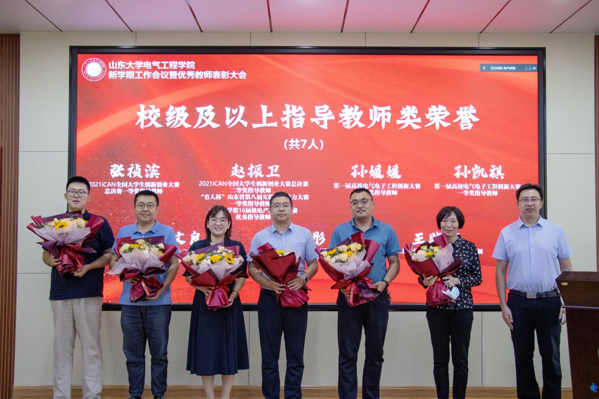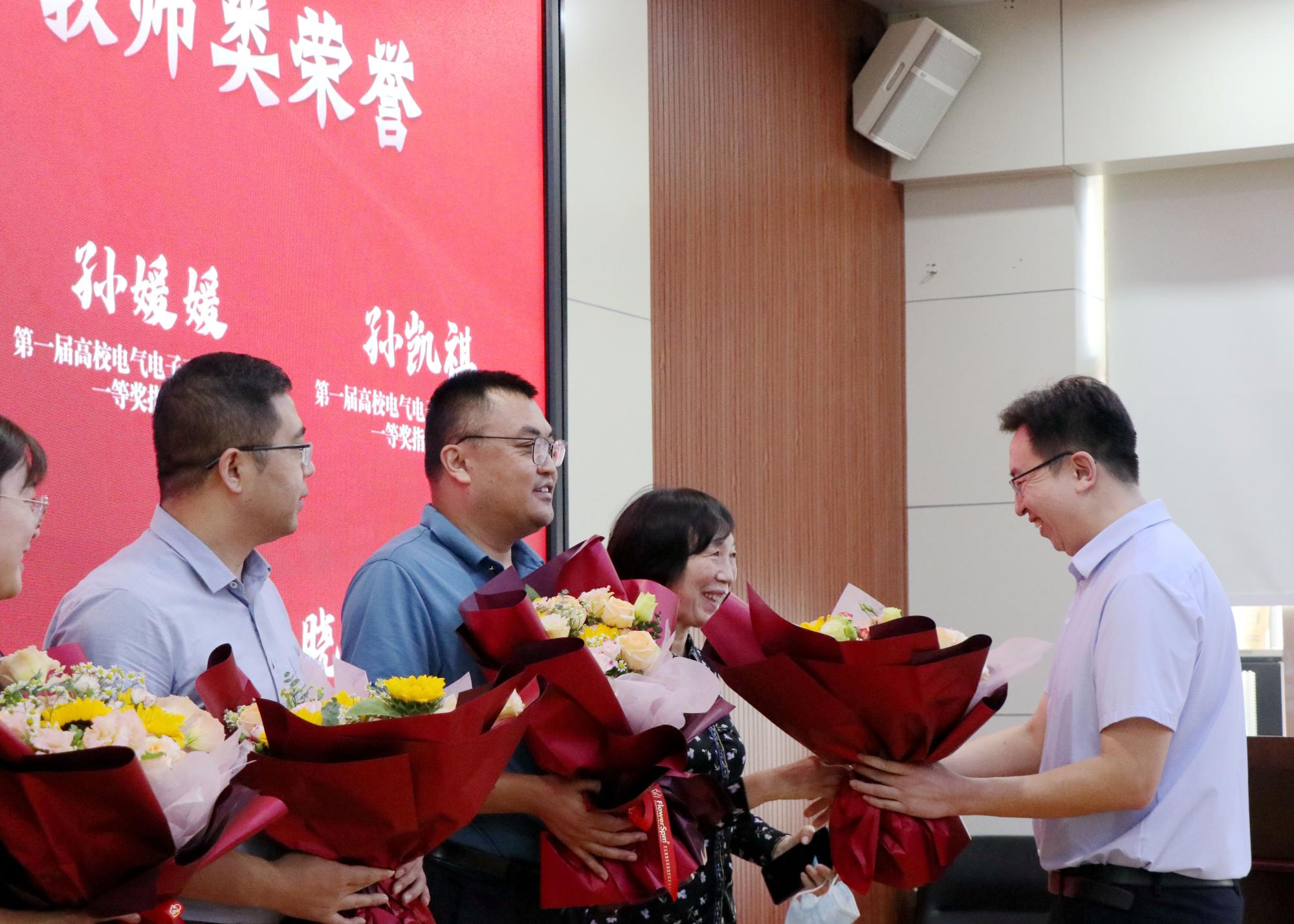 丁磊为获得校级以上荣誉的优秀教师献上鲜花,表彰他们为学院发展作出的突出贡献。