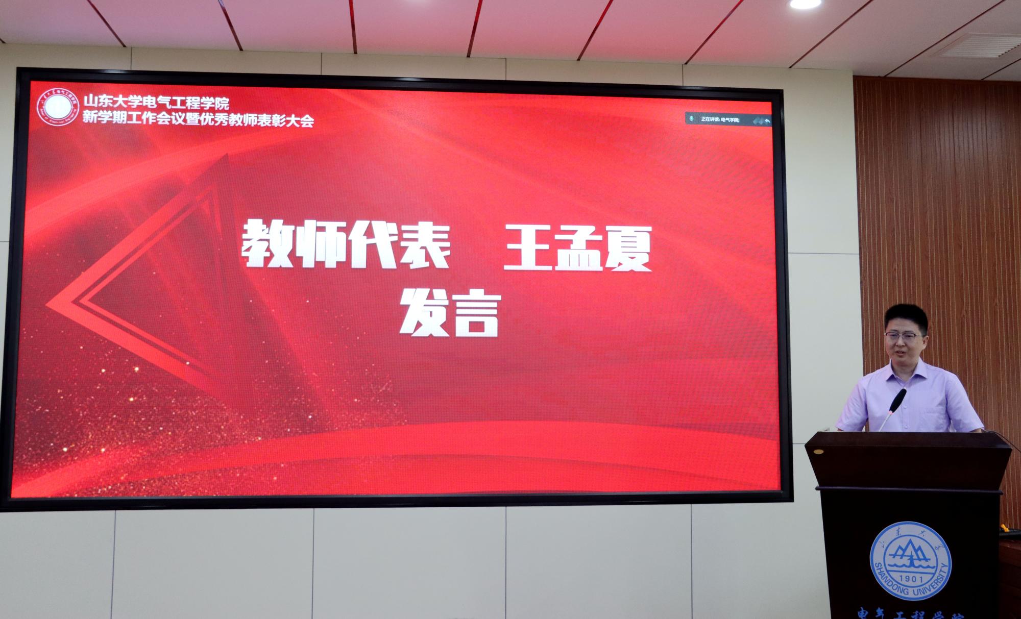 获奖教师代表王孟夏在发言中表示,是学院创造的良好平台推动了优秀成果的产出,并就参加教学比赛的过程谈了感受。他说,教学比赛看似是教师个人的呈现,但这背后很大程度要归功于平时在学院组织各项教学能力提升活动中获得的锻炼和积累的宝贵经验。另外,王孟夏还衷心感谢了没有站在领奖台上,却给予他无私帮助的老师和团队。“走下领奖台的一刻,成绩已经成为过去,坚守教育初心,勇担光荣使命,振奋精神,不骄不躁,努力为学院发展贡献更大力量。”王孟夏老师真挚地话语道出了学院全体教师的共同心声。