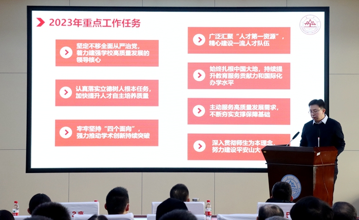 丁磊首先传达了学校2023年春季学期工作会议精神。主要包括李术才校长部署的七个方面27条重点任务、围绕“全力以赴抓落实、强力推动高质量发展”提出的三点要求以及郭新立书记在总结讲话中的“深学细悟、知行合一,持续推动思想认识的提档升级;守正创新、勇毅前行,持续推动战略行动的提档升级;攻坚克难、行稳致远,持续推动策略方法的提档升级”三点要求。丁磊从高标准通过工程教育专业认证、科研水平创新高(科研成果及重要奖项)、人才引育凸显力、信息化建设提成效四方面回顾了2022年学院工作成绩。并从党建工作、学生工作、本科教学、研究生培养、科研组织、平台建设、实验室建设、人事人才八方面部署了2023年重点工作。