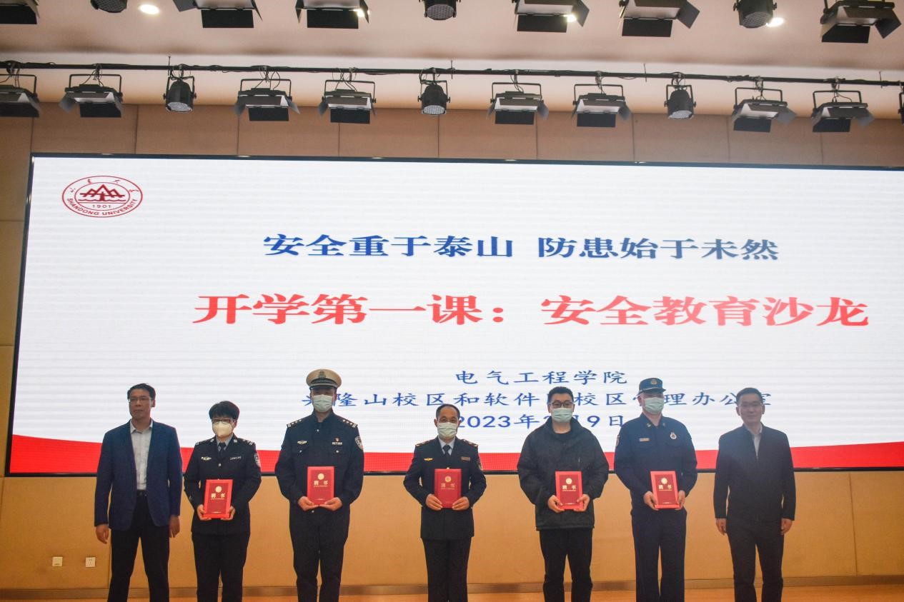 活动中,yl23411永利集团官网登录聘任5位校外专家担任学院学生安全导师,山东大学安全工作委员会办公室常务副主任类淑毅、兴隆山校区和软件园校区管理办公室主任王明山为济南市市中区应急局副局长张丹强、市中区水务局防汛抗旱服务部部长周冉、市中区交警大队十六里河中队中队长伊兵、市中区领秀城消防救援站战斗班班长秦高展、兴隆派出所派驻山大警务室民警杜瑛颖颁发聘书。