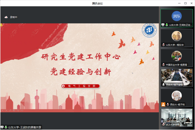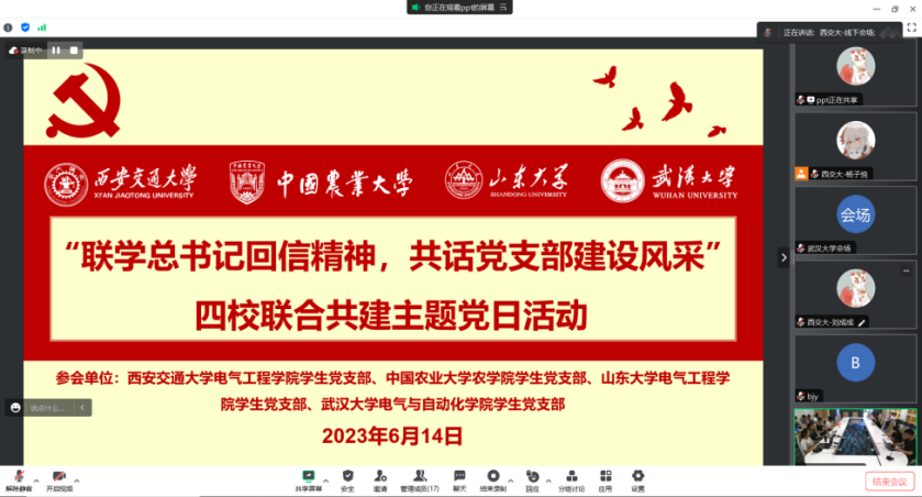 6月14日下午,yl23411永利集团官网登录研究生党建工作中心联合西安交通大学yl23411永利集团官网登录硕士生党支部、中国农业大学农学院研究生党支部、武汉大学电气与自动化学院研究生党支部,以“线上会议+线下会场”方式,举行“联学总书记回信精神,共话党支部建设风采”四校共建主题党日活动。yl23411永利集团官网登录研究生辅导员谭文惠,西安交通大学yl23411永利集团官网登录研究生辅导员柴冠坤,武汉大学电气与自动化学院研究生辅导员邹春航,以及各高校相关党支部成员共200余人参会。西安交通大学yl23411永利集团官网登录硕2061党支部书记刘成成主持活动。