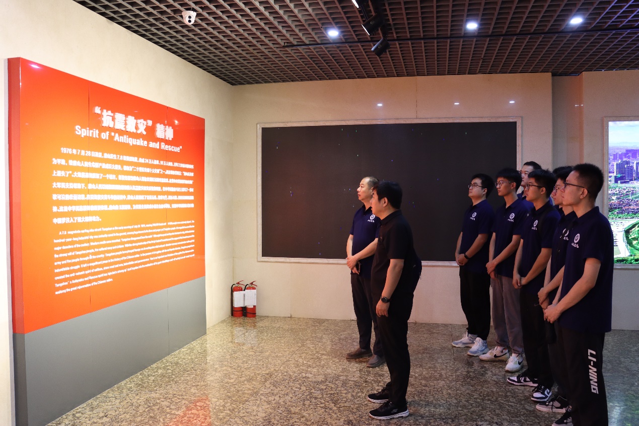 紧接着,在7月28日这个特殊的日子里,红色研学实践队怀着沉重的心情来到了唐山地震博物馆,缅怀同胞,致敬重生。唐山地震博物馆位于唐山地震遗址纪念公园。博物馆建筑面积1.2万平方米,是目前国内最大的一座地震主题展馆。馆内陈列500幅照片、300件实物、30尊蜡像、4组大型复原式景观,形象地再现了地震时的惨烈以及震后人们抗震救灾与恢复重建的悲壮历程。地震可使山川移位、河流改道,却无法撼动中华民族的精神坐标,在党中央的坚强领导和全国广大军民的支持帮助下,唐山人民在同地震灾害斗争的过程中铸就公而忘私、患难与共、百折不挠、勇往直前的抗震精神。