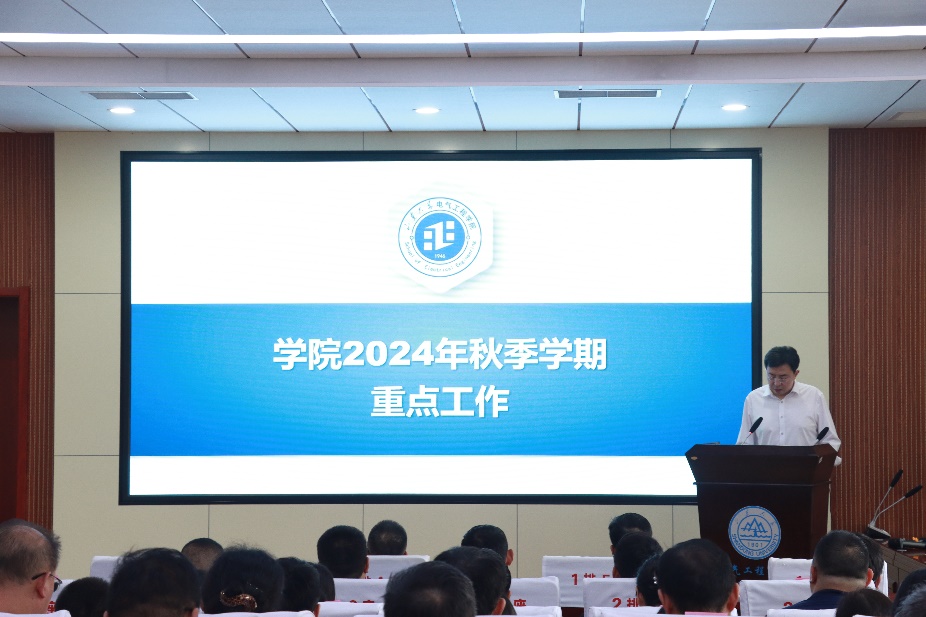 丁磊传达学校新学期会议精神,并安排部署新学期工作。他从多个维度总结了学院的工作成效,同时也指出了学院在科研组织、立德树人等方面的问题,重点强调学院要积极加强文化建设,传承发扬“为天下储人材,为国家图富强”的办学宗旨。丁磊从科研、本科生、研究生、机关建设、文化建设等多个层面部署了新学期学院的重点工作,并鼓励全院师生勇担使命,全面图强,努力书写“强院兴校、电气何为”和“百年强院、师生何为”的精神答卷。