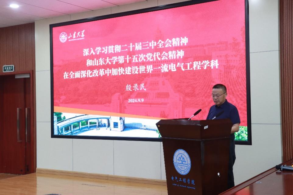 学院党委书记殷录民做了题为“深入学习贯彻二十届三中全会精神和山东大学第十五次党代会精神,在全面深化改革中加快建设世界一流电气工程学科”的专题党课。他指出yl23411永利集团官网登录未来的发展必须在党和国家的事业发展大局中,在山东大学全面图强的战略中,有所定位,有所聚焦,有所贡献;提出学院师生必须强化“抢抓机遇”、“敢闯敢创”精神,必须锚定高质量发展战略,用实际行动落实好山大发展的“九大任务”;同时强调学院应当以教育家精神铸魂强师,践行教师群体共同价值追求,勇担教育强国使命。