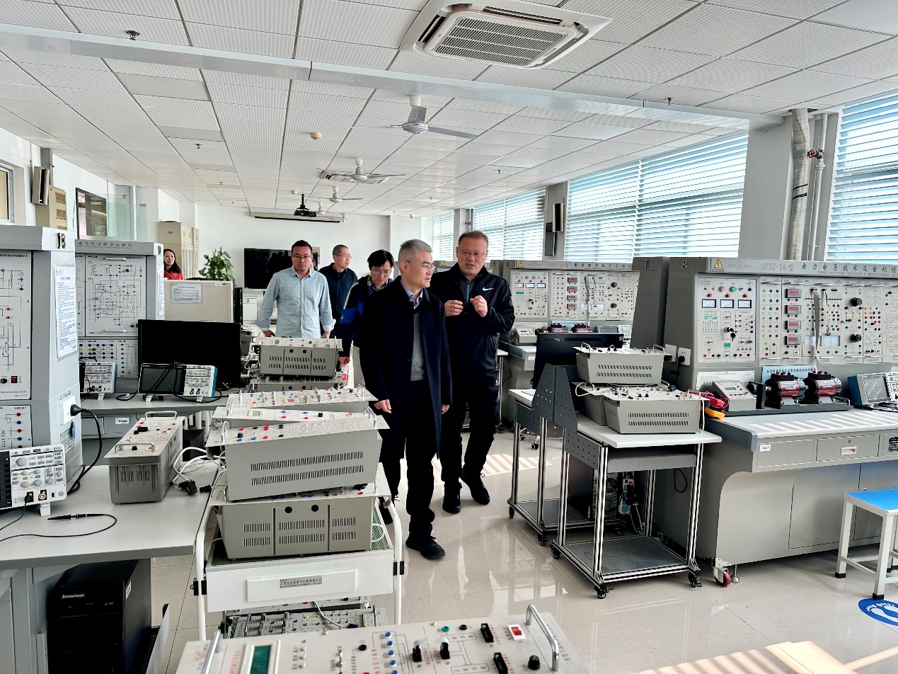 占金华重点调研了实验室建设现状、实验室空间利用情况和实验教学开展情况,详细了解自研自制仪器设备、创新性实验、虚拟仿真实验教学等情况。丛伟汇报了实验中心在校企融通、教研融汇方面的特色做法和工作成效。实验中心通过秉承“融通知识、锻炼能力、全面发展”的教学理念,已成为培养学生创新能力和实践技能的重要场所。中心目前面向工科8个学院开设电工电子基础实验及电气专业实验,年服务学生1200余名,年教学工作量近10万人时,极大地促进了学生实践能力和综合素质的提升。