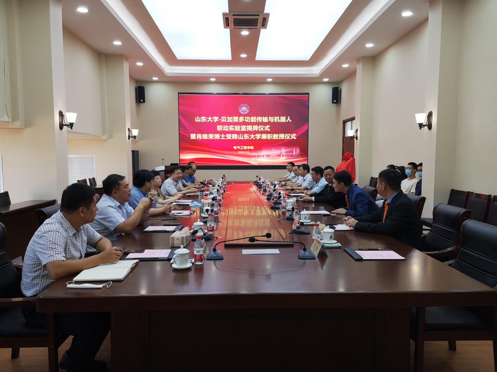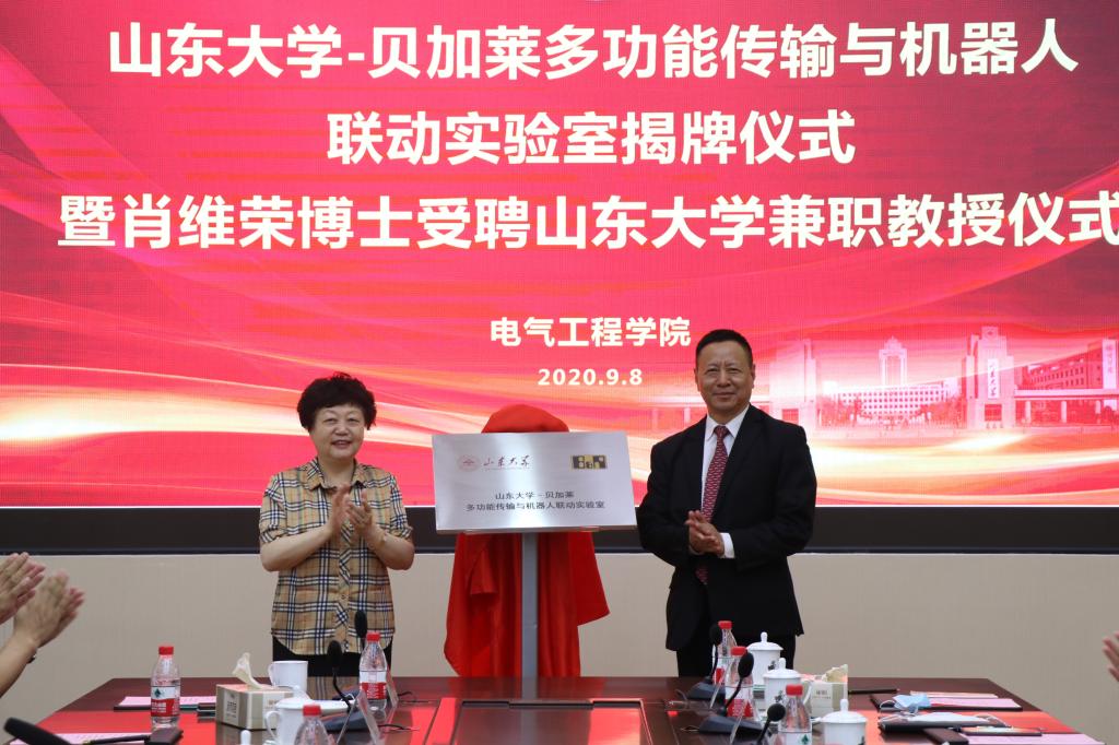 仪式上,樊丽明校长为肖维荣博士颁发山东大学兼职教授聘书,并共同为山东大学-贝加莱多功能传输与机器人联动实验室揭牌。樊丽明校长代表山东大学对肖维荣博士和贝加莱公司捐建实验室的义举表示感谢。她指出,实验室的建立,是校企双方主动顺应新时代发展潮流,深入对接国家科技发展战略的积极作为,是学校落实第十四次党代会决策部署、夯实学院办学主体地位、引导支持学院根据自身实际及学科特点,加强与企业沟通对接和产学研合作的具体举措。院企携手共进、优势互补、有助于推动双方形成学科和产业统筹融合、良性互动的发展格局,进一步促进教育链、人才链与产业链、创新链的有机衔接,推动电气工程学科在服务国家和区域经济中加快创新发展、特色发展、科学发展。下一步,学校将充分发挥科技、人才、平台优势,全力支持院企合作平台的建设和发展,努力推动院企深度协作、联合攻关和协同创新,推进高水平科学研究和共性关键技术的研发,为山东大学“双一流”建设、为加快实现学校“由大到强”的历史性转变打下坚实的基础。