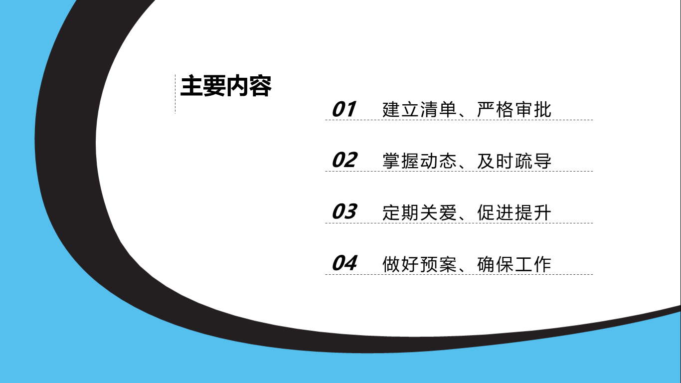 刘相宜强调,要建立网格化管理体系,全面掌握学生思想、学习、生活状态,联动任课教师、学生家长,精准帮扶三难学生;要经常深入学生,厚植底线思维,通过经验总结、问题梳理、模式创新形成高效管理服务体系。一是建立留校学生清单,传达学校疫情防控相关要求,严格管理出入审批;二是充分发挥党员、网格员作用,掌握三难学生的动态情况,及时疏导施策;三是定期组织线上活动将关心关爱传递给每位学生,促进学生的思想凝聚力、青春活力和学习动力提升;四是提前做好学生返校预案,确保底数清、动态明、重部署。