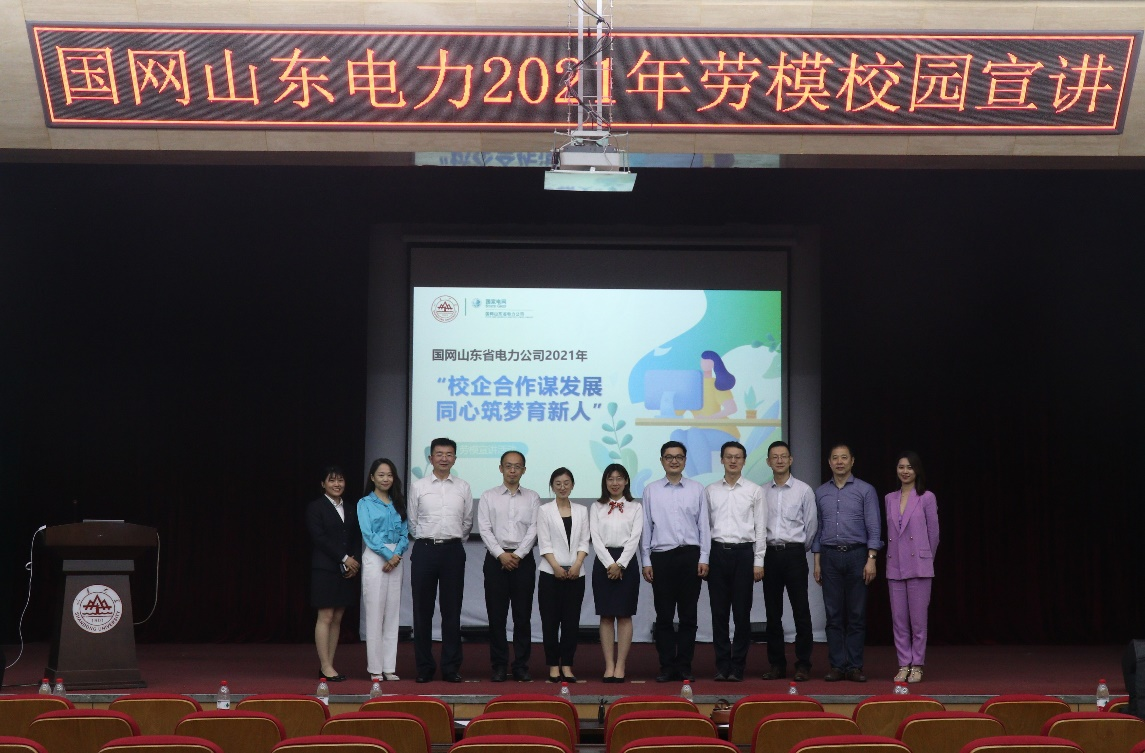 为落实山东大学与国网山东省电力公司校企合作协议,以劳模讲述、现场交流互动等形式,展现山东电力劳模风采和广大员工艰苦奋斗、守正创新的良好精神风貌,引导青年学子树立崇高的职业理想。2021年5月20日晚上,国网山东省电力公司2021年“校企合作谋发展 同心筑梦育新人”劳模宣讲活动在山东大学千佛山校区主楼3楼报告厅举行。国网山东省电力公司人资部副主任张鹏、员工处处长栾松涛,yl23411永利集团官网登录研究生办公室主任宋济平等出席活动。