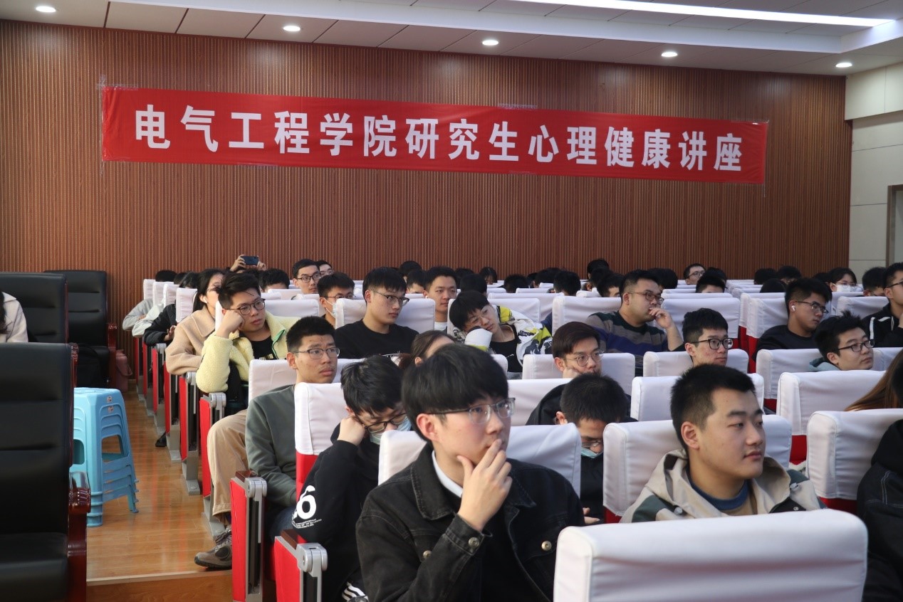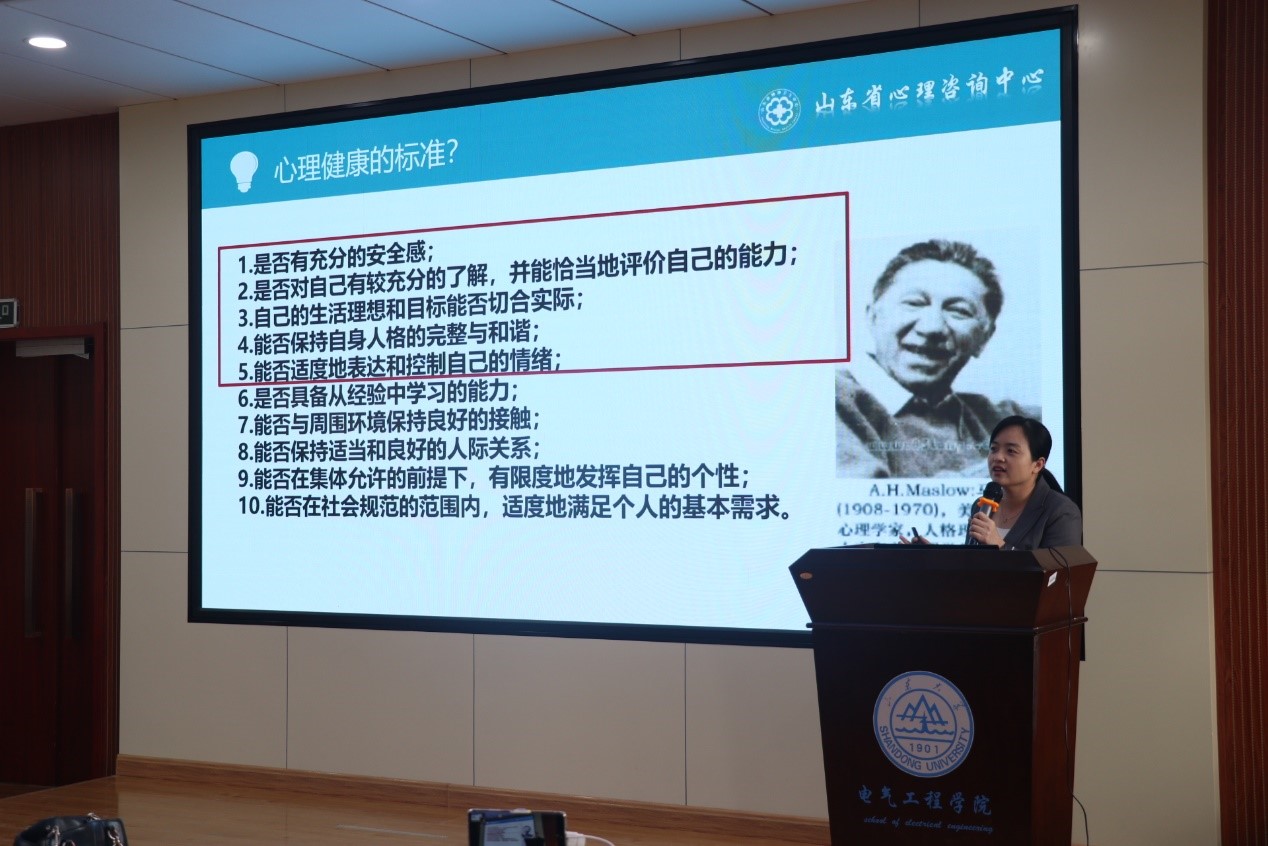2021年11月25日下午2:00-4:00,由山东大学学生心理健康教育与咨询中心主办,yl23411永利集团官网登录承办的山大幸福课—心理健康讲座活动于电力楼四楼报告厅顺利召开。本次讲座有幸邀请到山东省精神卫生中心临床心理一科副主任王丽娜老师作为主讲嘉宾。学院党委副书记宋思利,研究生办公室主任宋济平,学校心理咨询中心许晓梅老师以及一百多名电气学子参与了本次讲座。