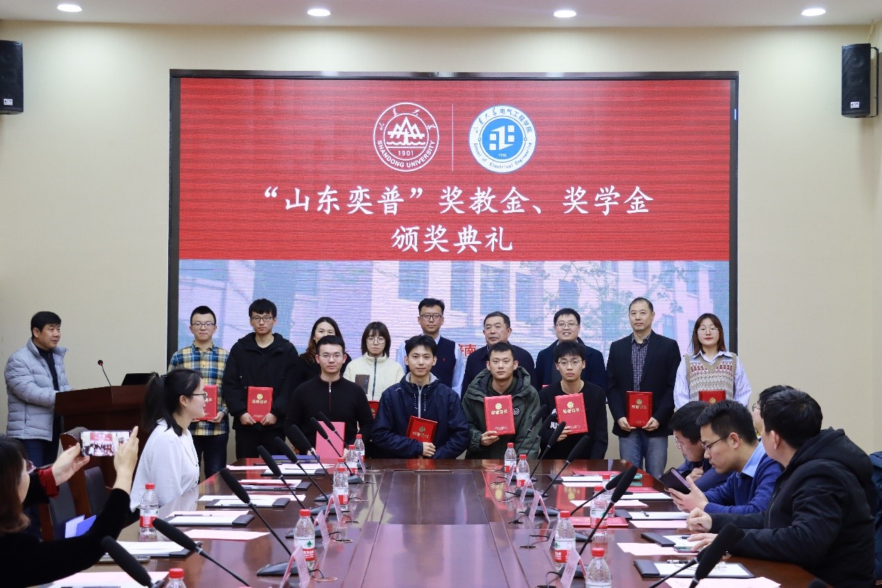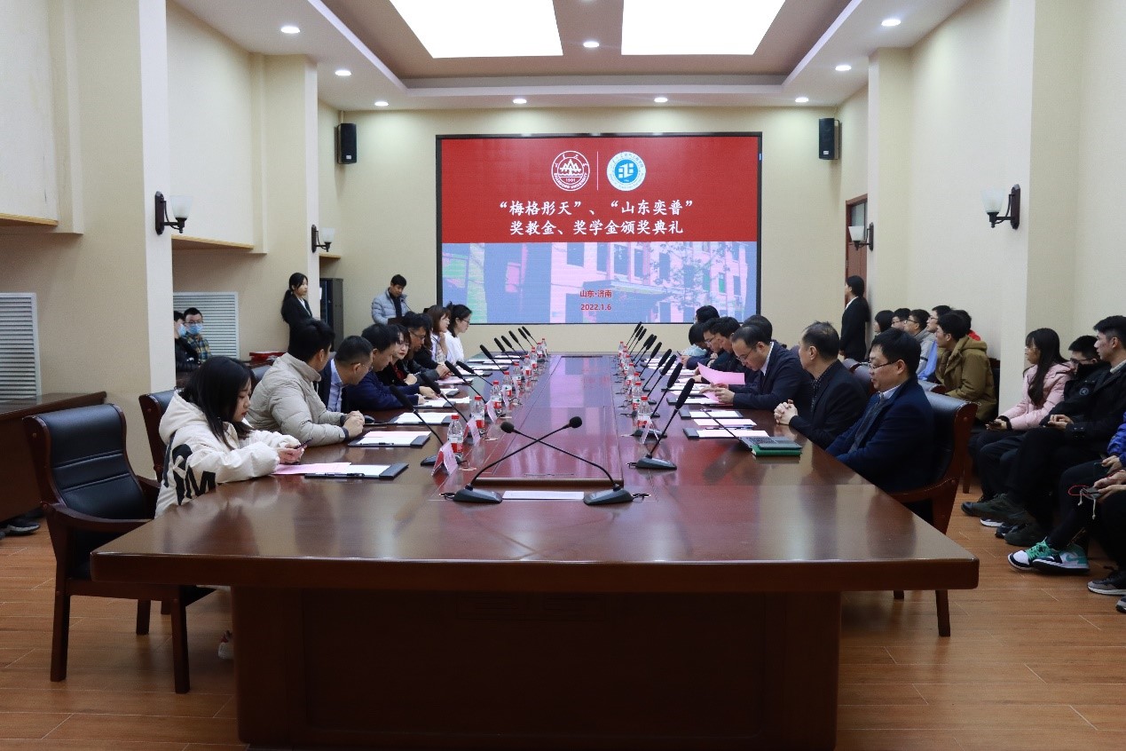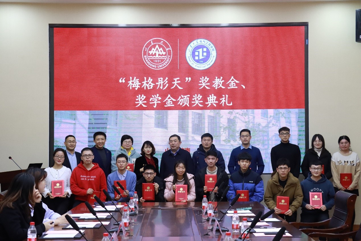 2022年1月6日下午4:00,yl23411永利集团官网登录2021年度“梅格彤天”、“山东奕普” 奖教金/奖学金颁奖仪式在千佛山校区电力楼5楼会议室隆重举行。山东梅格彤天电气有限公司董事长兼总经理徐晓梅、执行副总经理兼总工程师谷青松,山东奕普电气设备有限公司总经理胡喆,yl23411永利集团官网登录党委书记刘相宜出席活动,同时出席的还有山东梅格彤天电气有限公司人力资源总监梁志栋、企划经理王腾逸、企划专员宋芊芊,山东奕普电气设备有限公司人力资源总监何晓杰,yl23411永利集团官网登录副院长李清泉、副院长杨明、研究生办公室主任宋济平。学院党委副书记宋思利主持颁奖仪式。