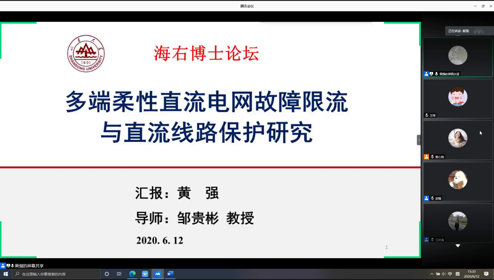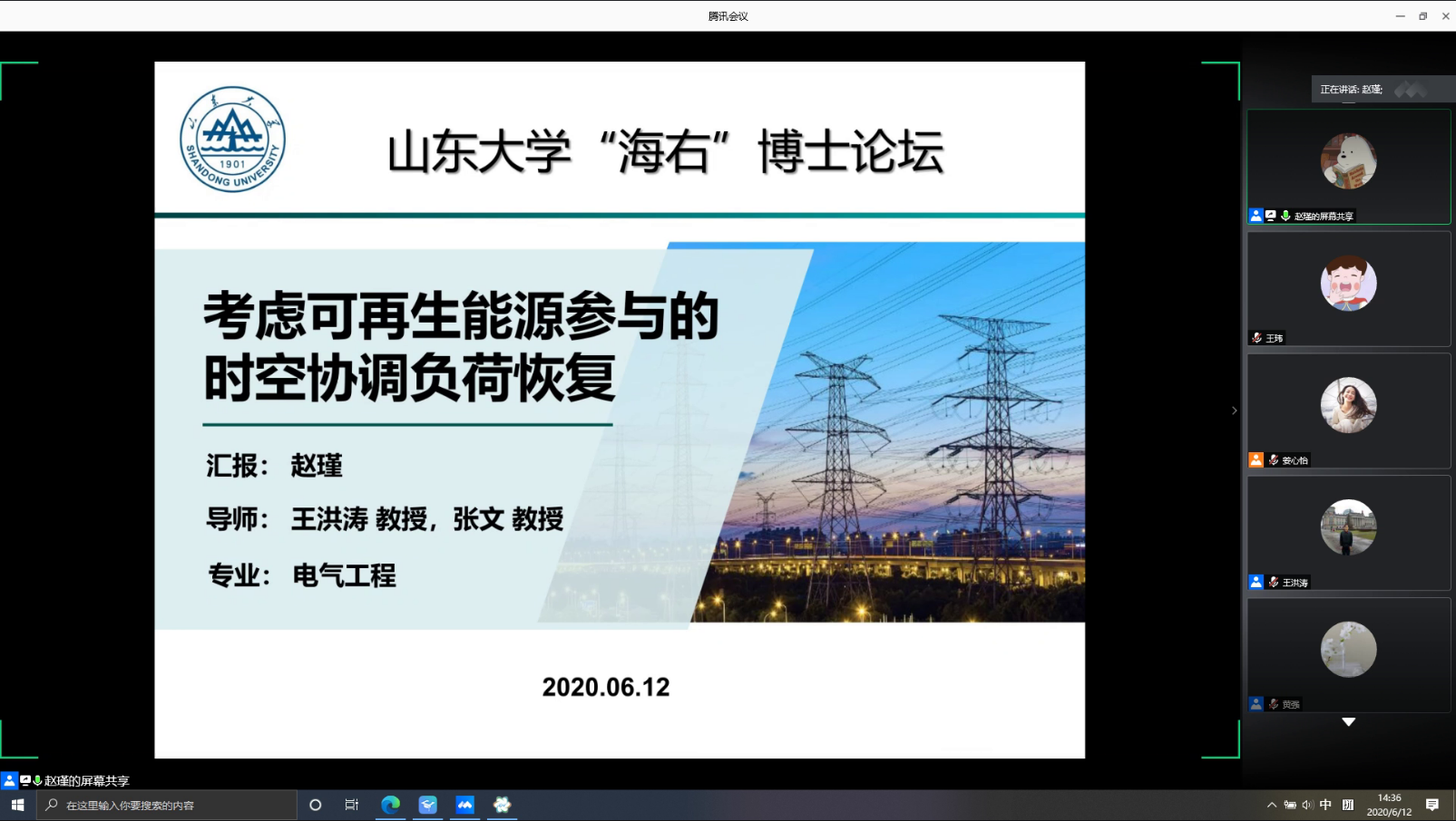 2020年6月12日下午14时30分,由山东大学研究生院、党委研究生工作部主办,yl23411永利集团官网登录承办的第22期(总第714期)“海右”博士生学术论坛在线上成功举办。本期论坛的主题为“智能电网继电保护与负荷恢复”,论坛邀请到了yl23411永利集团官网登录优秀博士研究生赵瑾、黄强为大家做报告。yl23411永利集团官网登录邹贵彬教授、王洪涛教授、学院党委副书记宋思利作为点评嘉宾出席了此次论坛。