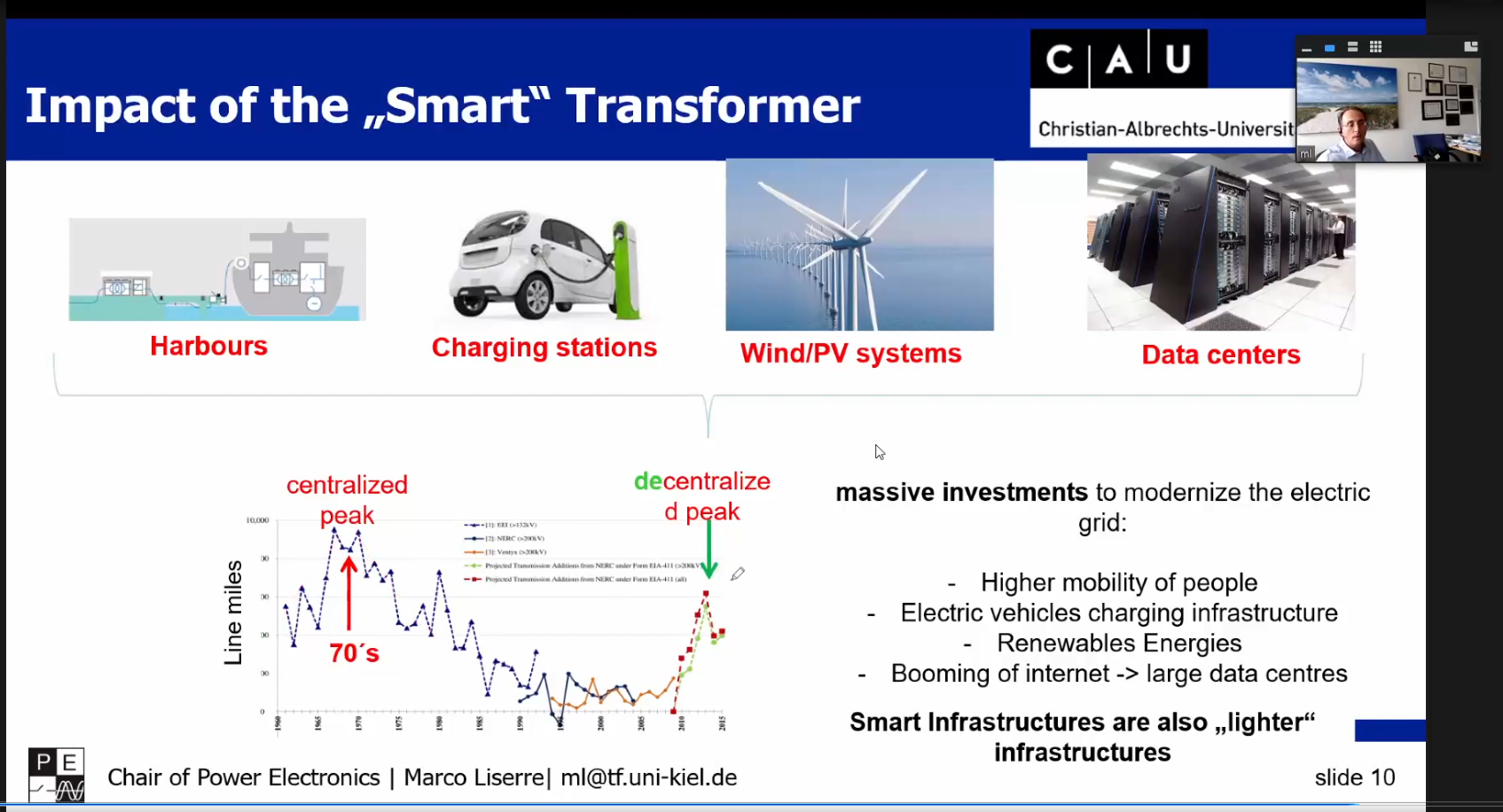 Liserre教授首先对应用于微网的电力变流器进行了分类,详细比较了电网跟随型与电网构成型变流器在概念、控制、应用等方面的不同,分析了二者的优缺点。之后,Liserre教授介绍了电力电子智能变压器的基本架构及其所涉及的组件,强调了在分布式发电比例增加、负荷变化剧烈的背景之下,智能变压器的突出优势。最后,Liserre教授详细阐述了智能变压器各个单元的结构设计、控制算法、技术挑战。