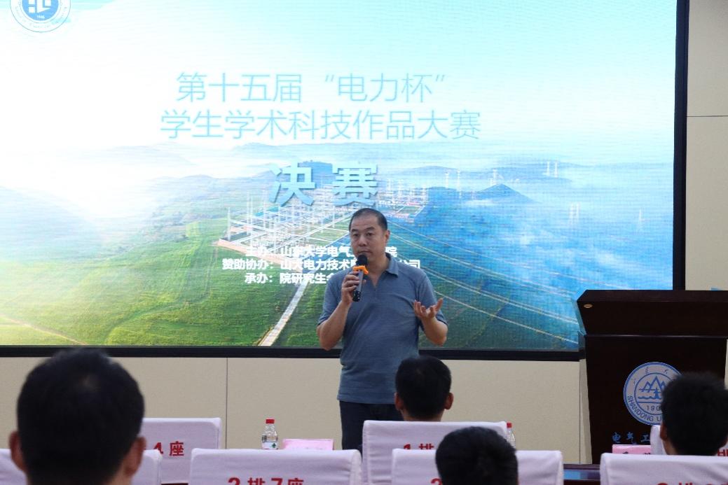 宋济平作总结致辞。他首先对山大电力15年来对“电力杯”的支持表示感谢。他指出,近年来“电力杯”自由命题作品不断适应青年项目落地及国家科技发展应用需求。“电力杯”大赛的指定命题具有一定的前瞻意义,鼓励同学们深挖题目内涵,契合国家应用需要。