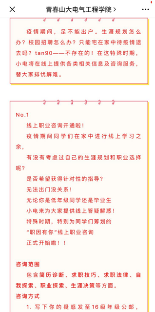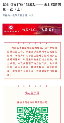 二是全面对接用人单位,及时发布就业信息。提前联系专业相关行业单位,了解单位需求,建议用人单位采取线上招聘的方式,为用人单位线上面试、签约等流程提供便利,通过多种渠道汇总招聘信息,借助“码”到成功—线上招聘信息一览,开展微信公众号推送和年级群发布的形式及时将招聘信息传达给广大毕业生。
