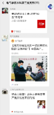 刘欣就习近平总书记重要讲话精神展开,针对疫情期间的相关舆情进行深入分析,并就优秀共产党员的感人事迹分享心得体会,带领支部党员以“高视角、高责任、高知识”面对疫情防控形势,督促党员发挥辐射作用,关注各类舆情导向,并以意见领袖的角色积极传播正能量。本科第三党支部以“党旗飘飘引领方向,愈难愈克青年担当”为主题开展抗疫资讯分享活动。会上,支部党员就自己所分享的抗疫资讯依次展开讨论,就战疫举措、抗疫英雄、防疫形势等方面探讨青年党员的责任与担当。支部党员紧密关注疫情发展,并积极向群众传达最新讲话精神、主动参加志愿者活动、进行自愿捐款、开展学困生帮扶等工作。