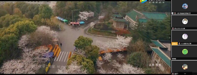 接下来开展“云赏樱”活动。第十二团支部樊嘉豪同学开启屏幕共享,大家共同观赏武汉大学樱花节的5G直播。视频画面精美,隔着屏幕都仿佛有春天的气息扑面而来。大家纷纷截屏通过腾讯会议讨论区分享,更是有同学晒出了自己出游拍摄的春景。活动结束,支部向大家征集春景拍摄作品和抗疫感悟文章,由大家投票选出“最美春花”和“最感动抗疫文字”。