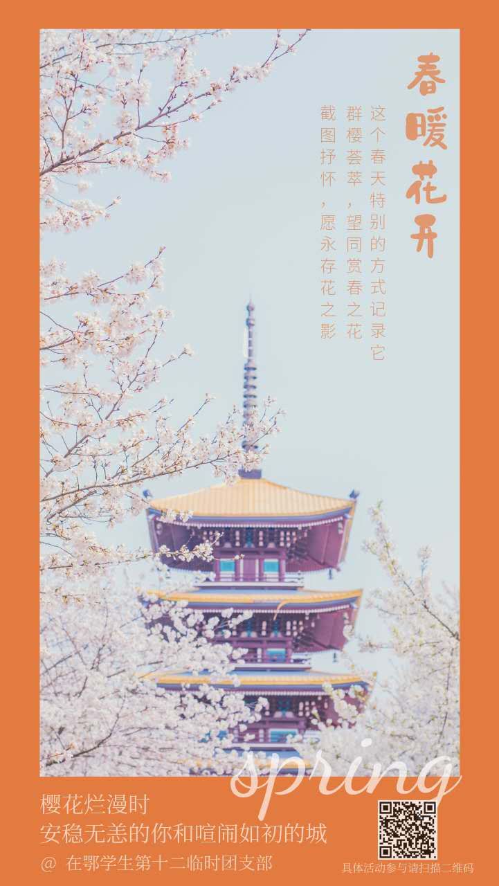 为进一步将支部打造成为展示在鄂团员青年在疫情防控中良好精神风貌与先进事迹的阵地,打造成为支部成员丰富居家生活、陶冶情操的阵地,3月22日上午在鄂学生第十二团支部联合在鄂学生第八团支部举办了“我在湖北的抗疫故事”主题团日活动暨“云赏樱”文艺活动。在鄂学生第十二及第八团支部全体支部成员参加活动。本次活动由第八团支部的陈诗雨同学进行主持。
