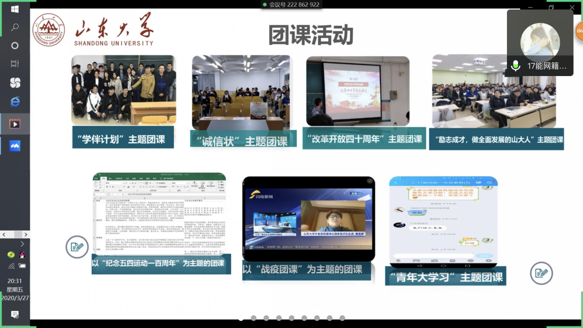 3月27日晚六点半,我院举行团支部升级达标答辩会,受疫情影响,本次答辩会线上进行。学院团委书记、16级辅导员邱瑶,17级辅导员陈冠廷,18级辅导员刘宁宁,19级辅导员刘欣出席答辩会,17级、18级和19级的团支部负责人悉数参加。