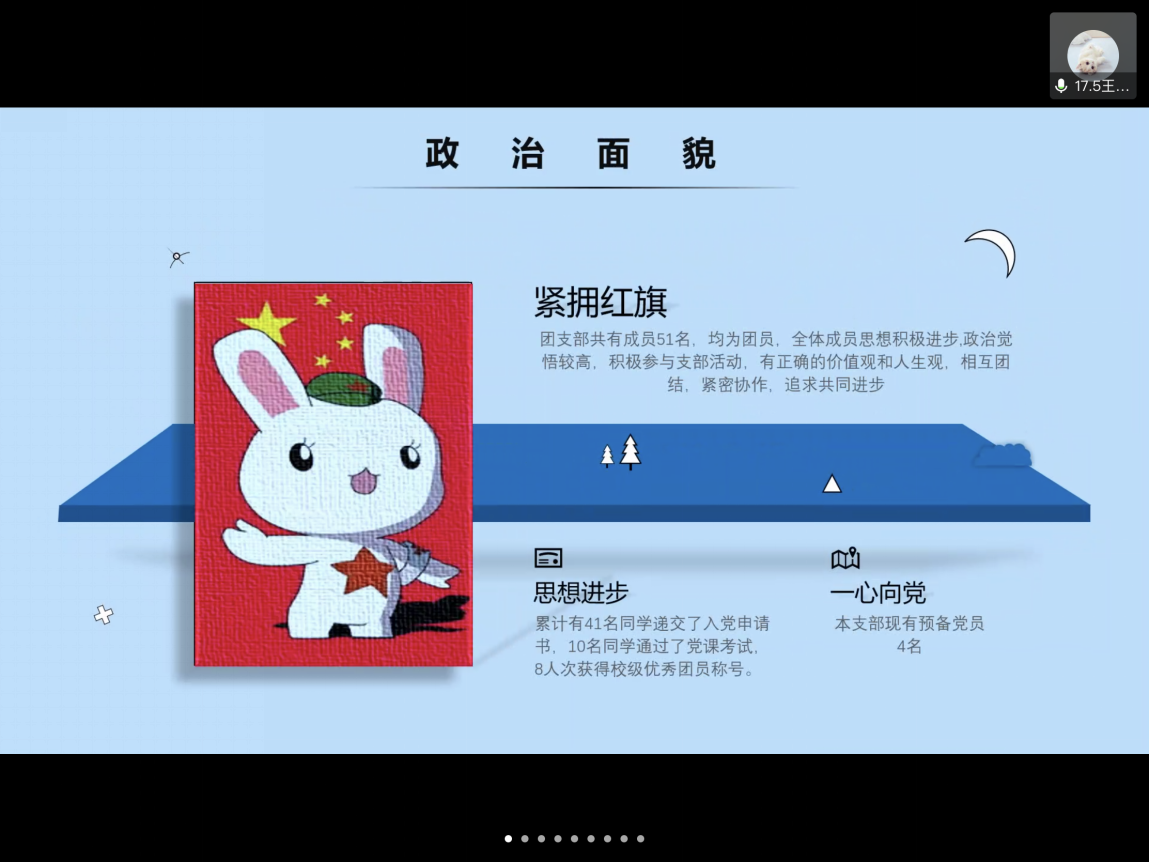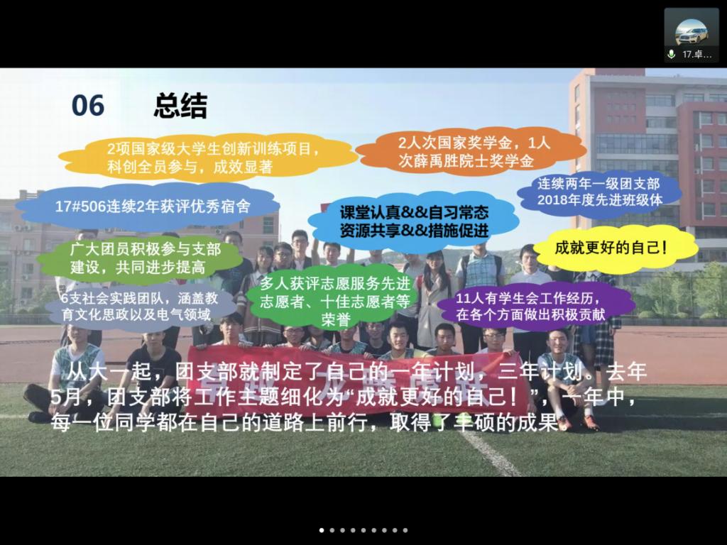 各个发言人答辩完毕后,邱瑶做了最后的点评,从认真扎实开展支部活动、学风建设科创活动重点突出、志服社实稳扎稳打、文体活动等几个方面高度评价了各个团支部的工作成果。邱瑶希望通过“达标升级”工作,以评促建,进一步优化团的基层组织内部机制,规范基层团支部工作体制,同时,对各团支部提出期望,希望团支书们能在以后的工作中认真落实民主评议、三会一课等重要工作。至此,团支部线上升级达标答辩会圆满结束。