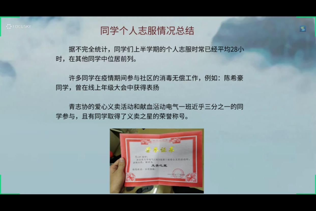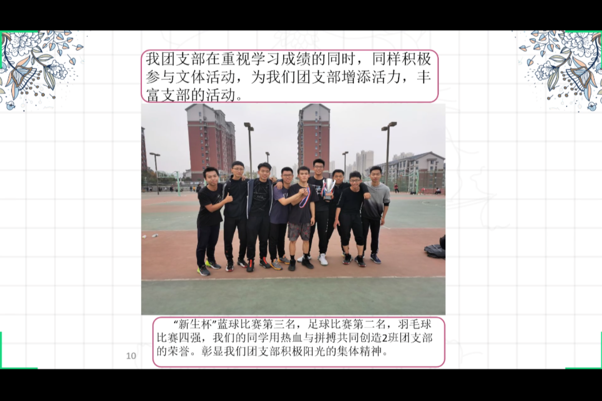 19级一班团支书邢博首先进行答辩,之后按照18级,17级的顺序依次进行。答辩的主要内容有团支部的思想建设、学风建设、科技创新、社会实践和志愿服务等,各团支部负责人围绕这几个方面向大家展示了团支部工作的成果。同时,各团支部负责人针对当前的新冠肺炎疫情的特殊情况对团支部工作稍作调整,假期期间也不懈怠。