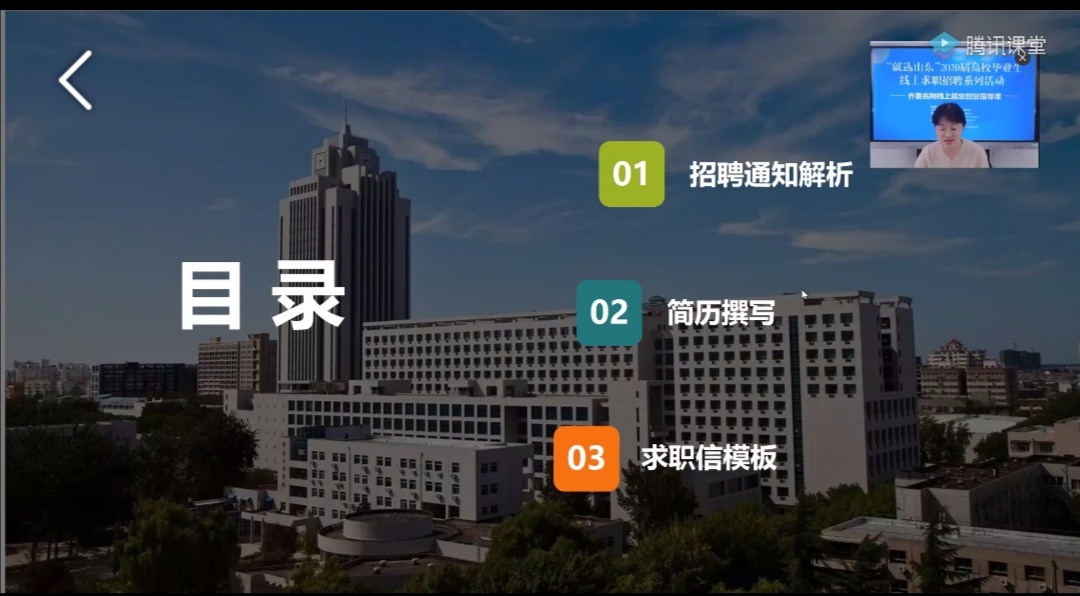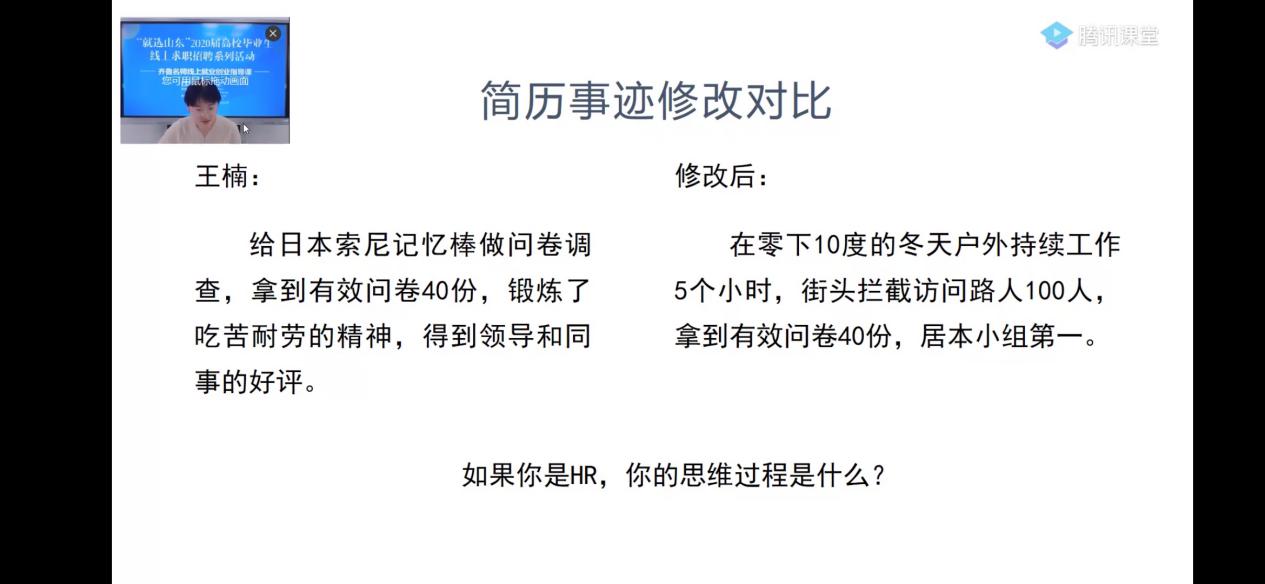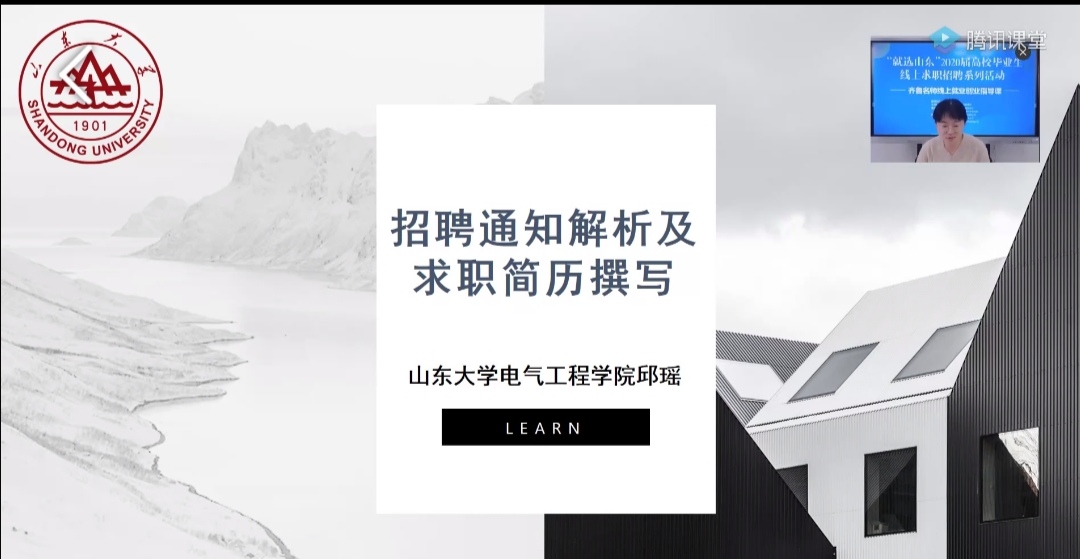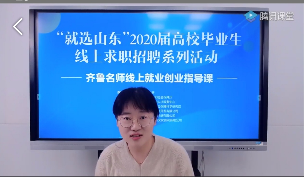 4月17日下午3时,第七期齐鲁名师线上就业指导课成功举办。本次课程由yl23411永利集团官网登录团委书记邱瑶主讲,通过腾讯课堂App进行直播授课,向广大应届毕业生讲解如何解析招聘通知以及如何撰写求职简历。