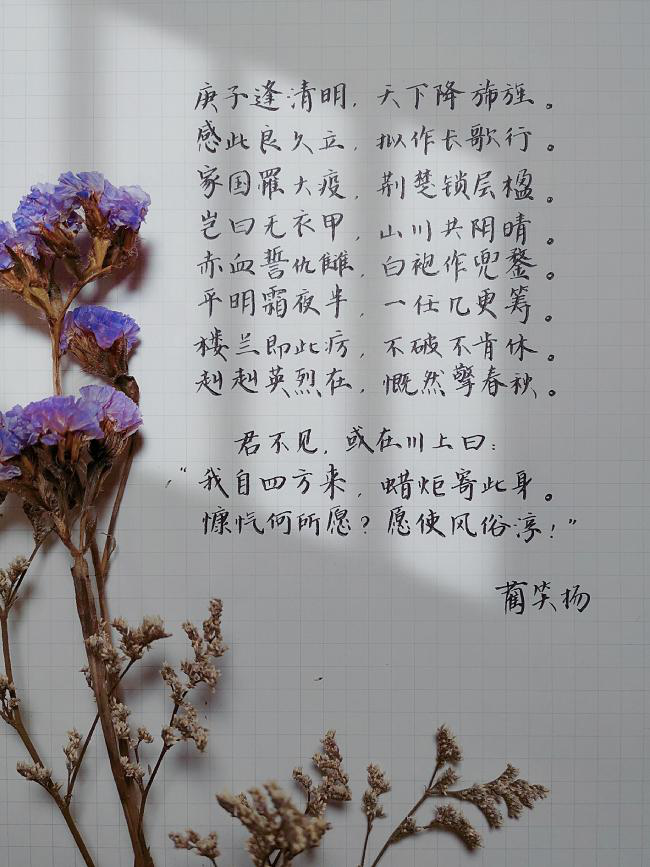 工科生亦有笔墨诗怀。在清明国祭日之时,蔺笑扬同学写就一篇仿古《长歌行》,遥寄战疫英烈。摘此一段,以飨诸君。亦有刘郅晨同学写一封信笺以寄心思。