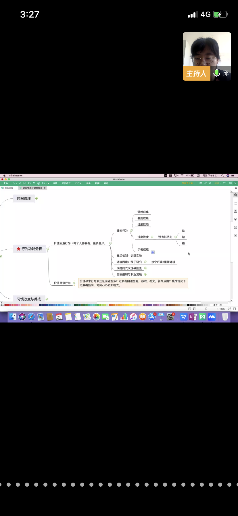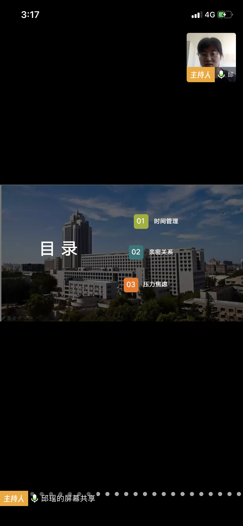 邱瑶就疫情期间同学们长期宅家学习出现的问题进行剖析,从时间管理、亲密关系、压力焦虑三方面给同学们分享宅家保持良好心态的方法。