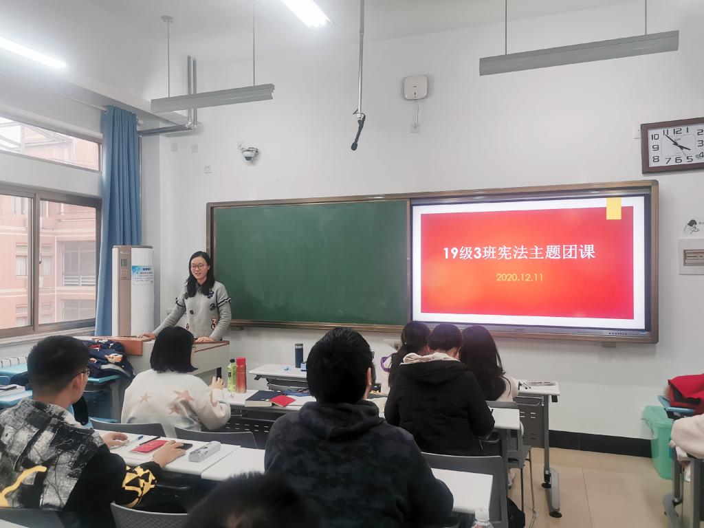 扎根青年,厚植法律宣传教育情怀。作为青年学生学习先进思想和理论的基层组织,学院团支部从每一位团员入手,全面开展“学宪法讲宪法”主题团课。各班团支部结合自身特色,以宪法精神的宣传教育为落脚点,以宪法内容晨读朗诵、青年讲法翻转课堂、班级宪法知识竞答为主要载体,深入学生群体,着眼于青年个体,使每一位青年学生做宪法的聆听者、守护者、践行者。