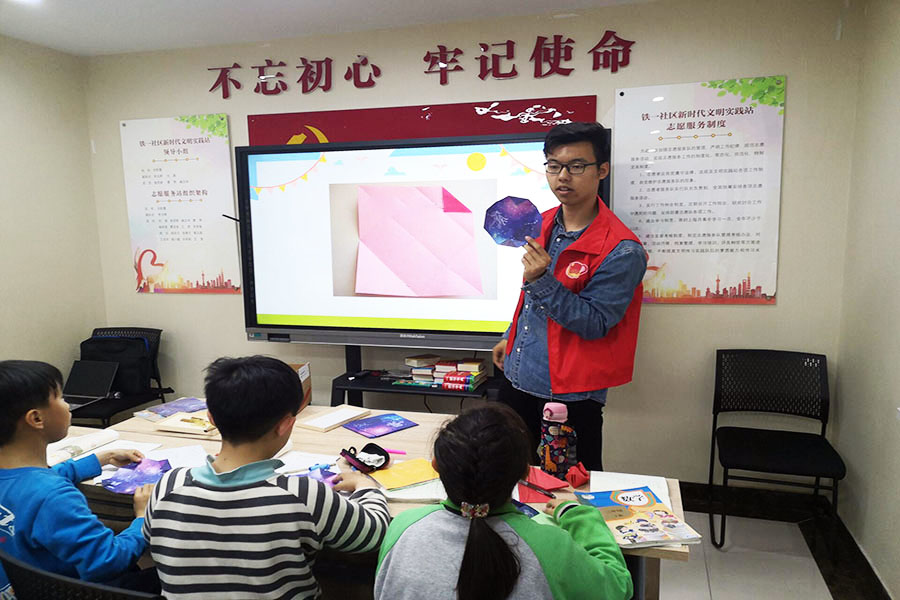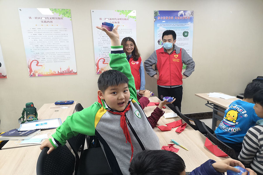 课程开展当日,项目组成员带着准备好的道具与奖品到达铁一社区,于课前拷贝好ppt并发放做手工用的彩色卡纸。课堂上,孩子们认真听讲,积极发言,回答讲课的老师提出的问题并领取了精美的书签作为奖品,并在其带领下进行垃圾桶小盒子的制作,整节课氛围轻松活跃。