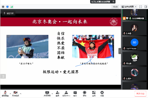 2月27日,yl23411永利集团官网登录本科2019级辅导员刘欣于线上举办2019级“开学第一课”,以中国队代表运动员谷爱凌、苏翊鸣等为例,分析运动健儿们身上的自信、热爱、团结、奉献等一系列优秀品质,并对同学们的个人规划提出建议,鼓励学子们合理规划时间,积极调节情绪状态,寻得自己所爱,不负青春时光。