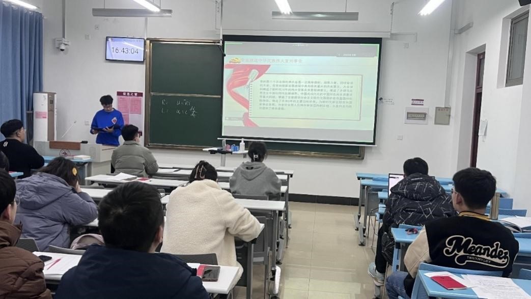 王震宇代表本科第一党支部进行领学。他紧扣党的二十大精神,重点围绕“坚持中国共产党领导是实现中华民族伟大复兴的根本保证”“坚持中国特色社会主义是实现中华民族伟大复兴的必由之路”“实现高质量发展是实现中华民族伟大复兴的基础前提”等重要表述分享个人的学习心得体会,鼓励同学们结合学校、学院下发的学习材料深入学习贯彻党的二十大精神,以实际行动推进中国式现代化。