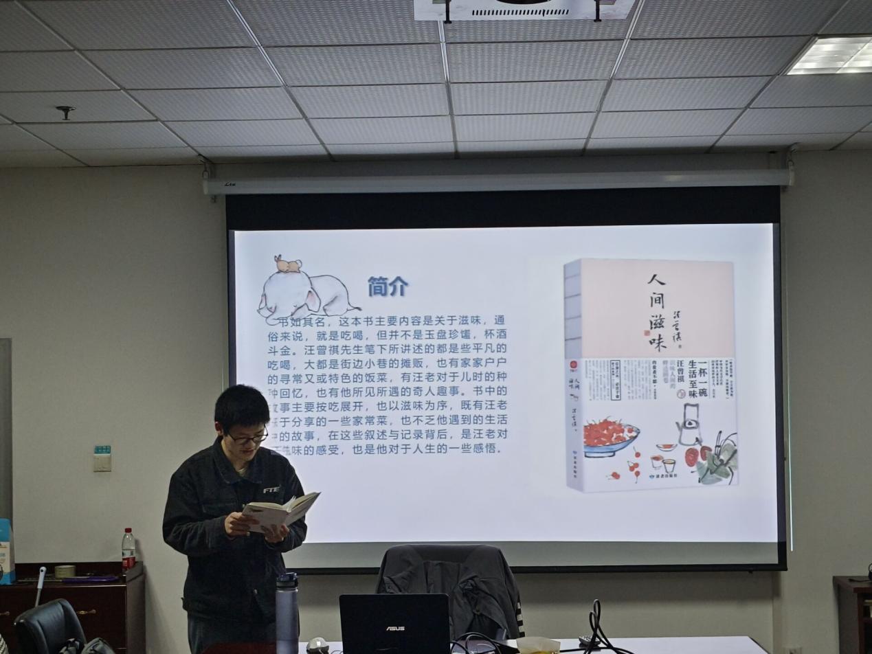 第一位分享人张振鑫向大家分享了书籍《人间滋味》。张振鑫先对书籍内容进行了简单的介绍。汪曾祺先生笔下的《人间滋味》所讲述的都是些平凡的滋味,有街边小巷的摊贩,也有家家户户寻常的饭菜,有汪老对于儿时的种种回忆,也有他所见过的奇人趣事。书中的故事主要围绕吃展开,过程中穿插汪老生活中遇到的趣事,在这些叙述背后,是汪老对于滋味的感受,也是汪老对于人生的一些感悟。张振鑫同学还摘选了书中一部分内容朗读给大家听,并描述了自己对这本书的一些感悟:他认为本书通篇语言朴实,字里行间有着一种烟火气,不多文字便道出了所回忆的饮食与生活,也正是在这种回忆中,他看到汪曾祺先生故乡的味道,与他五湖四海的吃喝经历。自古功成属少年,但在休息时,或许这种带有烟火气的文字是一种很好的放松。