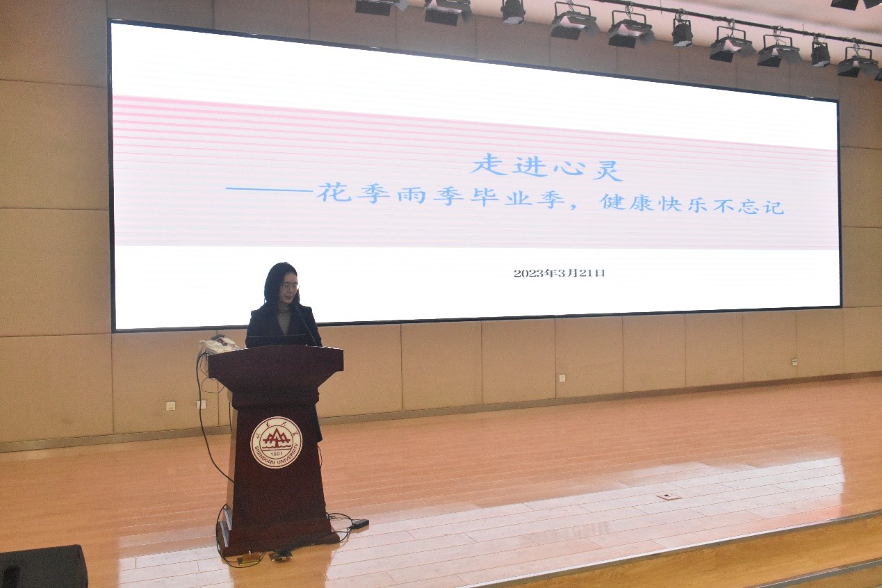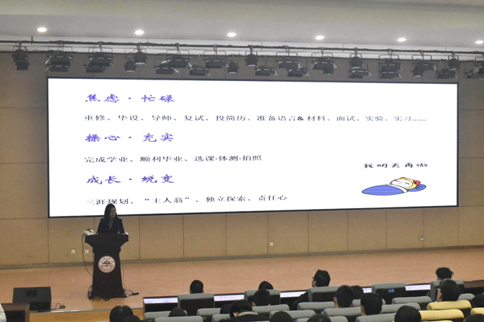 会上,刘欣对“毕业季”这一特殊时期的含义作出解读,指出当前毕业年级学生存在 “焦虑与忙碌”“操心与充实”“成长与蜕变”等思想和心理状态,带领同学们回顾从选课到体测,再到完成学业、顺利毕业的四年大学生活,引导同学们明确“三涯”规划,树立主人翁精神,培养独立探索的能力,在生活中提升“责任之心”,实现个人全方位发展。随后,她对学子们的身心健康提出了相关建议,引导同学们尝试与焦虑做朋友,遇到问题主动求助,时刻保持能量充沛、积极自省了解自己,立足当下制定计划,通过结交新朋友、各校区打卡、毕业随手拍、班级团建等方式开启快乐生活,享受幸福人生。