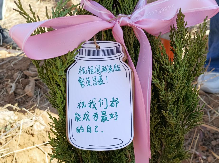 3月12日上午,各位志愿者抵达活动现场,植树活动正式开展。志愿者们用铁锹、锄头、铁镐等工具挖好植树土坑,清理土坑中的碎石块,为小树苗的生长提供足够且良好的生存空间。同学们将小树苗植于坑中,有序填埋土壤,围堆石块,保证小树扎根生长期间挺直抗倒伏。以上工作完成后,各位志愿者用分发的丝带装饰小树苗。2022级辅导员刘德硕与2020级辅导员邱瑶对此次活动的重要意义作出充分肯定,并与同学们一起为小树浇水,在卡片上提笔写下对小树的真情祝愿。随后,活动参与人员在植树现场集体合影留念。