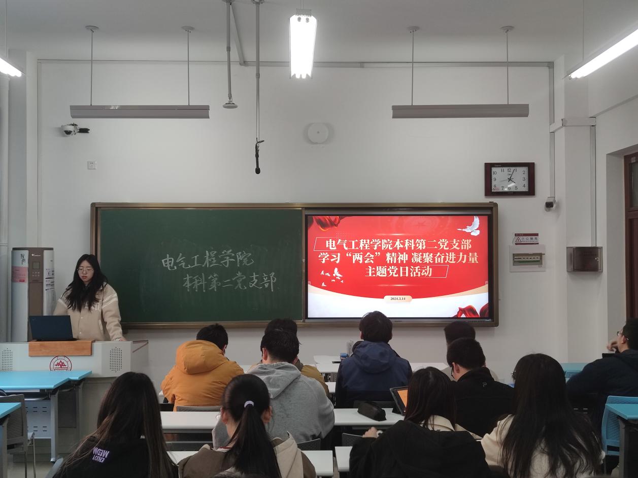 3月14日,为使本科第二党支部全体青年党员学深悟透“两会”要点,把准时代脉搏,本科第二党支部开展学习交流活动。党支部书记邱瑶同志介绍了全国两会召开的重大意义,普及了全国两会的内涵、性质和区别、两会的新看点、工作报告要点以及发展的主要预期目标等相关知识。本科第二党支部全体党员就“两会”精神展开热议。任馨月同志表示,新时代、新征程、新伟业,作为新时代青年党员,我们应当树立“青春之我”的奋斗之姿,扛起“强国有我”的青春之责,将所学知识转化为报效祖国的担当,刻苦学习科学文化知识,努力利用自己的专业所学,为国家电力行业贡献出自己的一份力量,让青春在全面推进中国式现代化国家的火热实践中绽放绚丽之花。