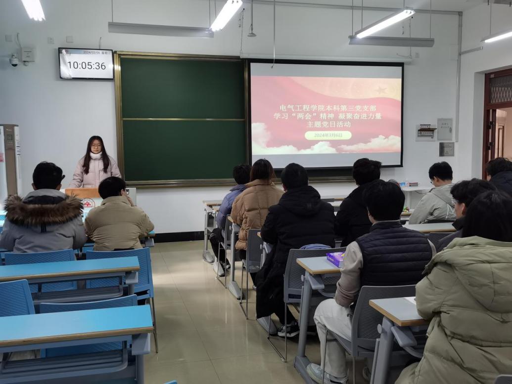 3月6日,为深入学习贯彻十四届全国人大二次会议精神,提升党员的政治理论素养和业务能力,本科第三党支部组织学习“两会”专题会议。王朱明同志通过PPT演示、视频播放等形式,领学了政府工作报告的主要内容。全体同志重点学习了报告中关于经济发展、社会建设、民生改善等方面的内容及习近平总书记在参加江苏代表团审议时的讲话,支部成员深入探讨了如何将这些政策精神落实到具体工作中去。支部成员表示,对于电气学子来说,要扎实学习基础知识、提升实践能力、关注行业动态和技术发展,为未来的职业发展奠定坚实的基础。会议最后,党支部书记唐晓曼同志对本次学习进行了总结。她强调,全体党员要以此次学习为契机,树立远大理想,提高自身素质,以更加饱满的热情投入到学习工作中去。
