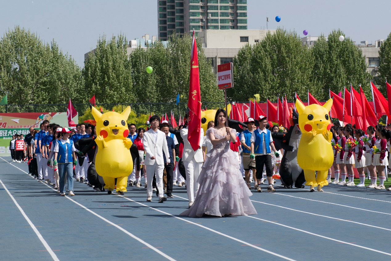 电若游龙,气贯长虹。声振寰宇,势破苍穹。伴随着欢快悦耳的旋律,电气学子身着红蓝队服,意气风发,士气昂扬,迈着整齐坚定的步伐向主席台走来。yl23411永利集团官网登录方阵带来皮卡丘对战喷火龙的精彩情景剧表演更是展现了电气学子无限青春活力与蓬勃朝气,舒缓了运动会紧张激烈的氛围,收获了现场观众的热烈掌声。