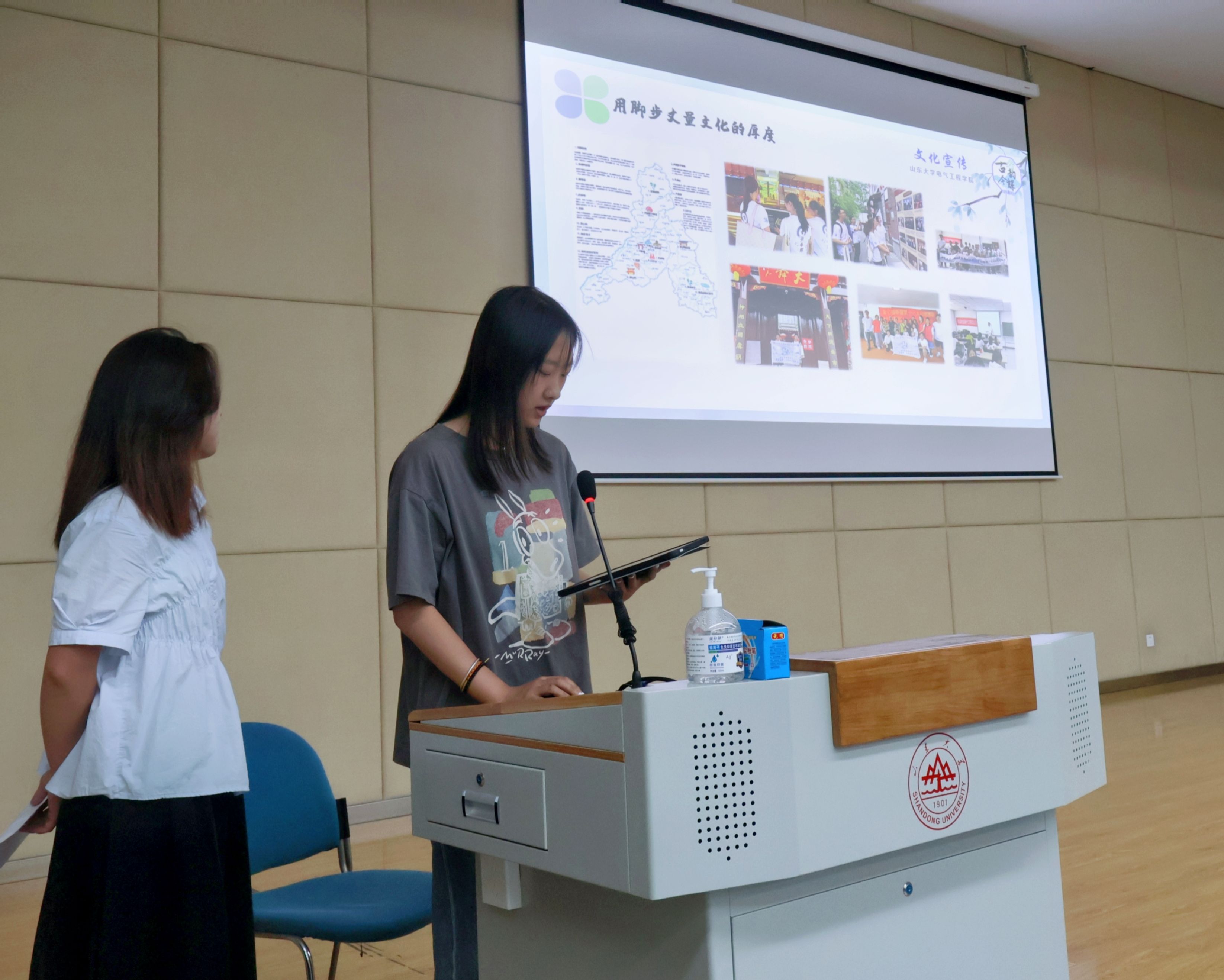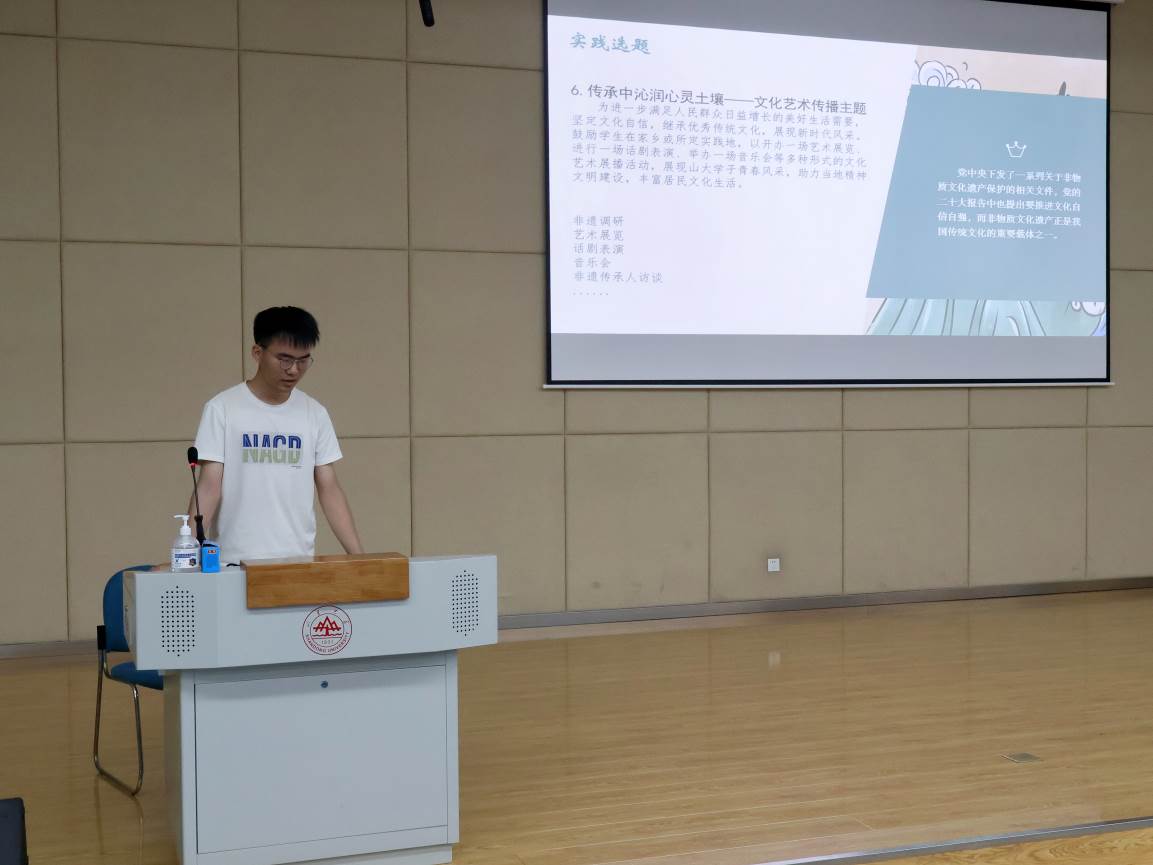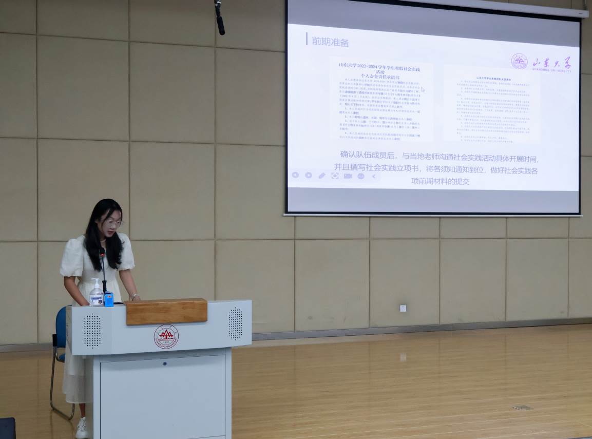 曾诗韵、杨子超代表山东大学“古韵今辉”文化宣传社会实践队分享社会实践经验。曾诗韵就团队实践内容进行讲解,“古韵今辉”文化宣传社会实践队践行“四位一体”,活动形式丰富多样,用实际行动弘扬文化,让传统文化与现代文化有机交融。杨子超综合团队开展活动的过程,指出社会实践团队成员应各司其职、互相协作,共同从多维度推进活动展开。在活动宣传方面,杨子超举例讲解了多种宣传途径,建议同学们结合线上推文与线下展台的形式进行活动宣传。