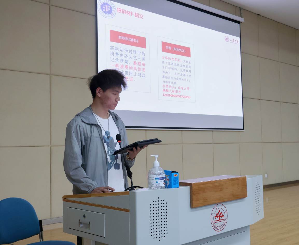 会上,王迪介绍了社会实践活动的具体流程、组队及立项要求,带领同学们学习撰写结项书与社会实践报告,并阐述了不同情况下的跨学院证明盖章流程。杜铭燊着重介绍了暑期社会实践报销政策、综测加分政策,又从投稿平台与写作指导等方面展开投稿经验的分享,使同学们明确了社会实践投稿的相关要求。